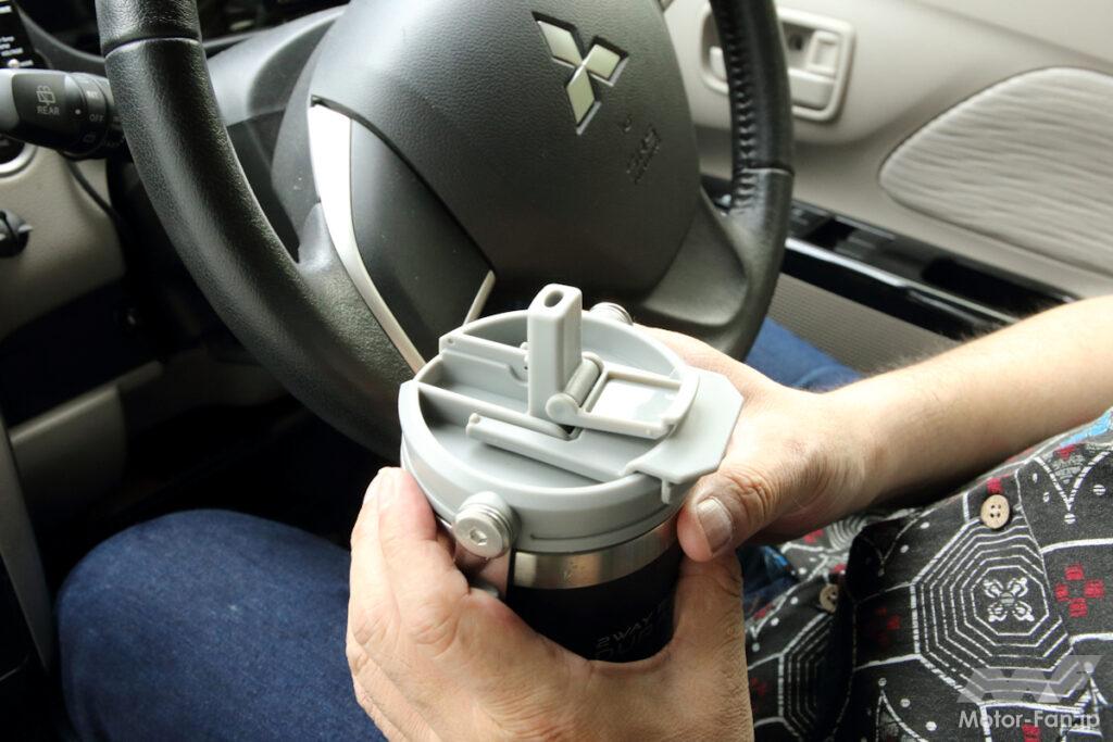 容量は約550mlと標準的なペットボトル1本分が入るジャストな容量で、ドライブ中の適度な水分補給に最適。しかもドリンクホルダーにちょうど収まるサイズなのだ。適度な重量感で安定性も抜群。カーブの多い山間部のドライブでも、倒れてこぼす心配はなさそうだ。
