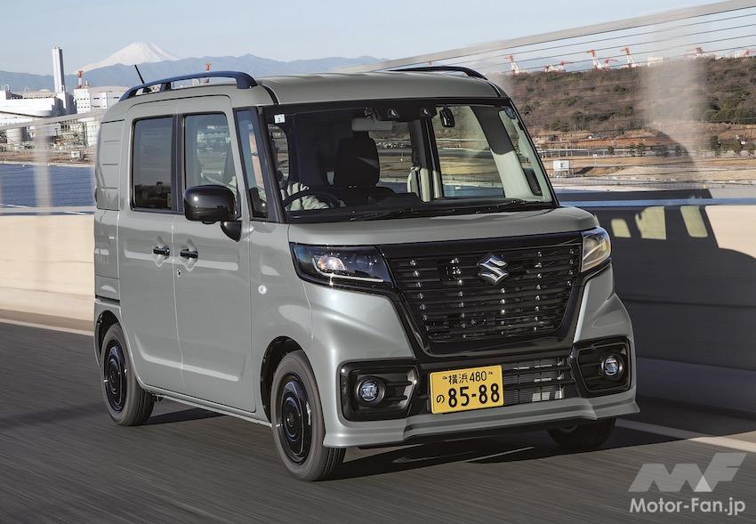 ベースは両側スライドドアを備えた乗用軽自動車の先代スペーシア。グリルは先代MC前の精悍なスペーシアカスタム! のもので、さらに先代スペーシアのクロスオーバーモデルであるスペーシアギアの撥水シート地、ルーフレールを採用。パワートレインは52㎰、6.1㎏mの自然吸気のみで、CVTや足まわりなども先代スペーシア用を踏襲。しかも、155/65R14サイズのタイヤは商用車用ではなく、ワゴンRスマイル用で、積載耐荷重200㎏に対応するため空気圧を高めたもの。つまり、先代スペーシアを4ナンバー化するため、後席から後ろ部分は別アレンジながら、エクステリアデザイン、中身はほぼ先代スペーシアそのもの、ということになる。