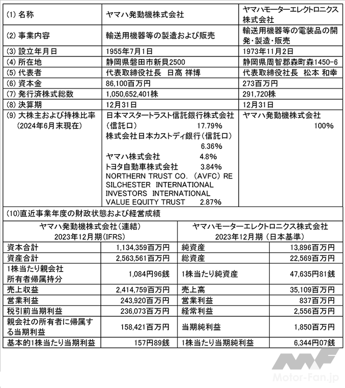 本合併によるヤマハ発動機の名称、所在地、代表者の役職・氏名、事業内容、資本金および決算期に変更はない。