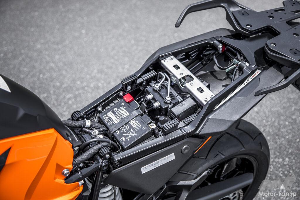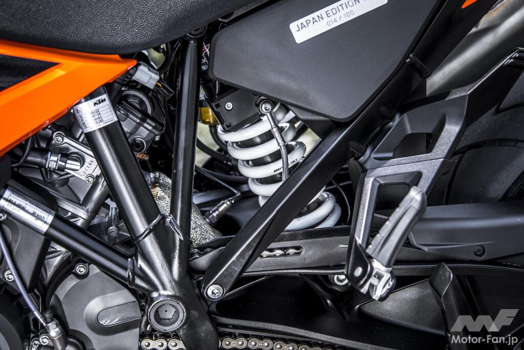 ホワイトのコイルスプリングが印象的なモノショックは、WP製の新世代SAT(セミ・アクティブリアショック・テクノロジー)を搭載。可変式の減衰機構を持ち電子制御される。