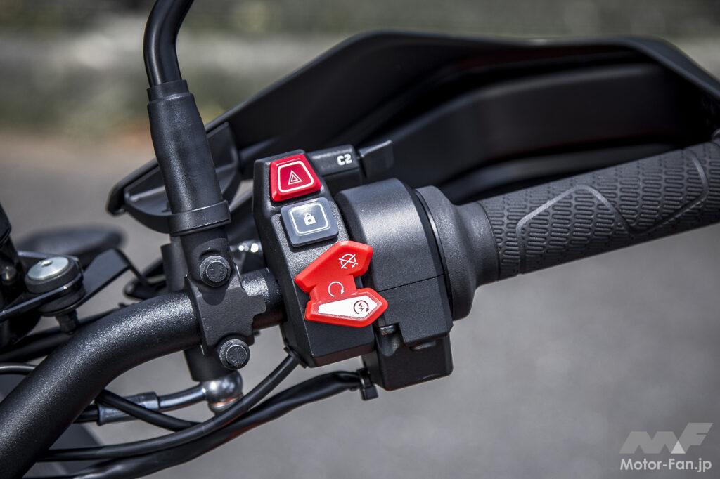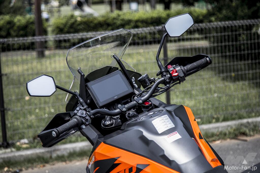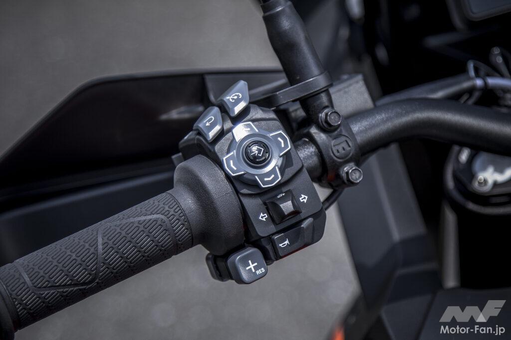 ブラックアウトされたハンドルバーは、高強度アルミ製テーパードタイプ。空力特性が追求されたヘビーデューティなハンドガードが標準装備されている。クリアのウインドシールドは簡単な手動(ダイヤル)操作で高低差55mm(9段階)の高さ調節ができる。給油口の前方に防雨構造のスマホ収納ポケットが装備されている。