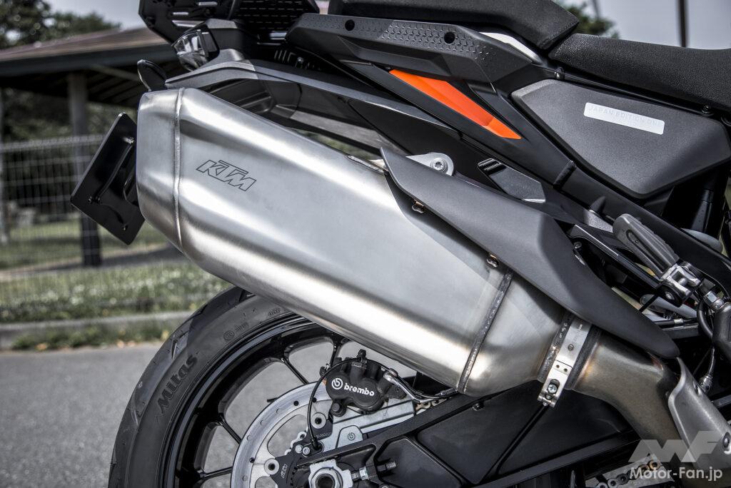 新設計の右アップマフラーはステンレス鋼製。三つのO2センサーと二つの触媒コンバーターが組み合わされ、緻密な空燃比制御と排出ガスの浄化が成されている。