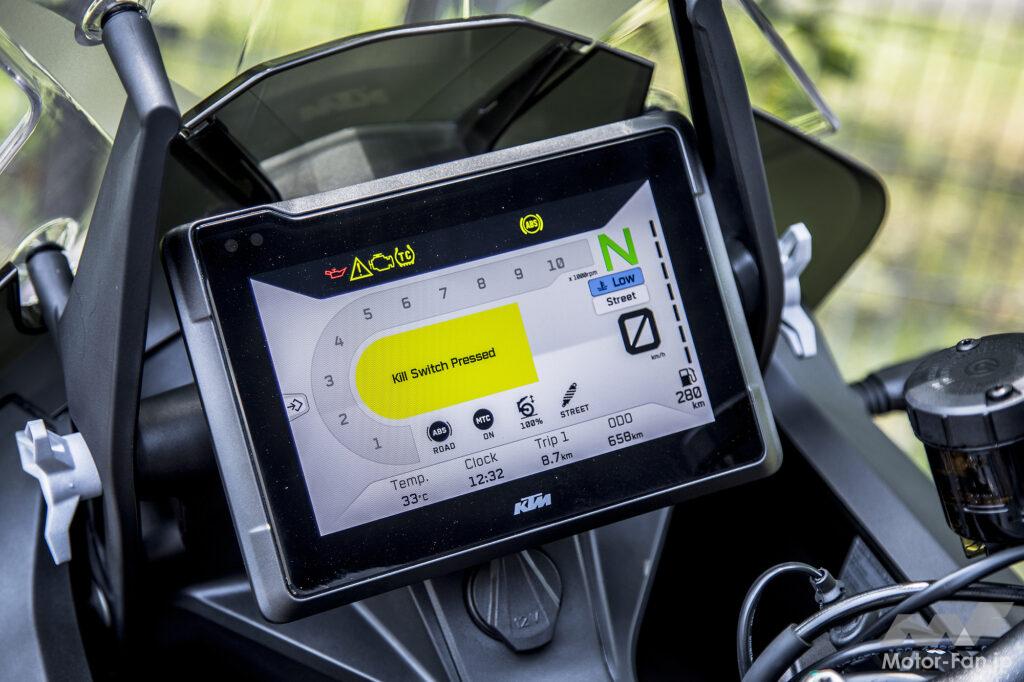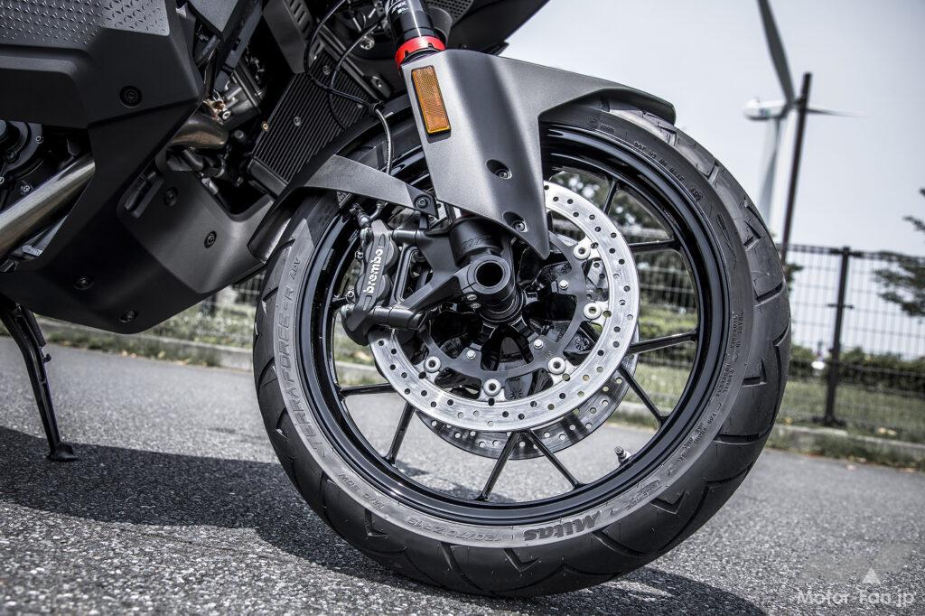 WP製セミアクティブテクノロジー採用のフロントフォークはφ48mmの倒立式。ボトムにラジアルマウントされた油圧キャリパーはブレンボ製の対向4ピストン。フローティングマウントされたダブルディスクローターのサイズはφ320mm。