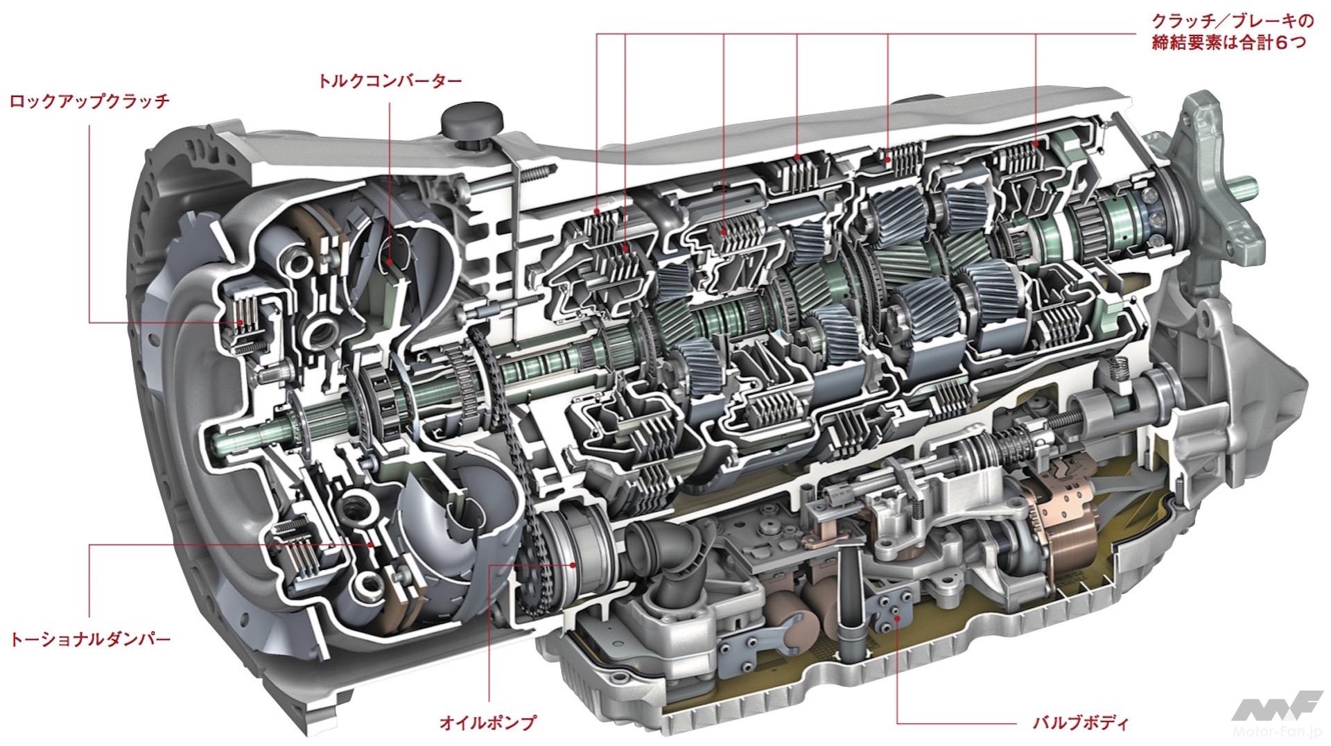 「7速ATではケース外側にあったパークギヤを内蔵したうえで寸法は同じ。トルクコンバーターにはペンデュラムアブソーバー(遠心振り子ダンパー)を装備し、このぶんの寸法が増えたが、ギヤボックス側をコンパクトにすることで吸収した。また、7速にあったふたつのワンウェイクラッチも廃止した。従来の7速ATのスペースにそのまま載せられるサイズだ」