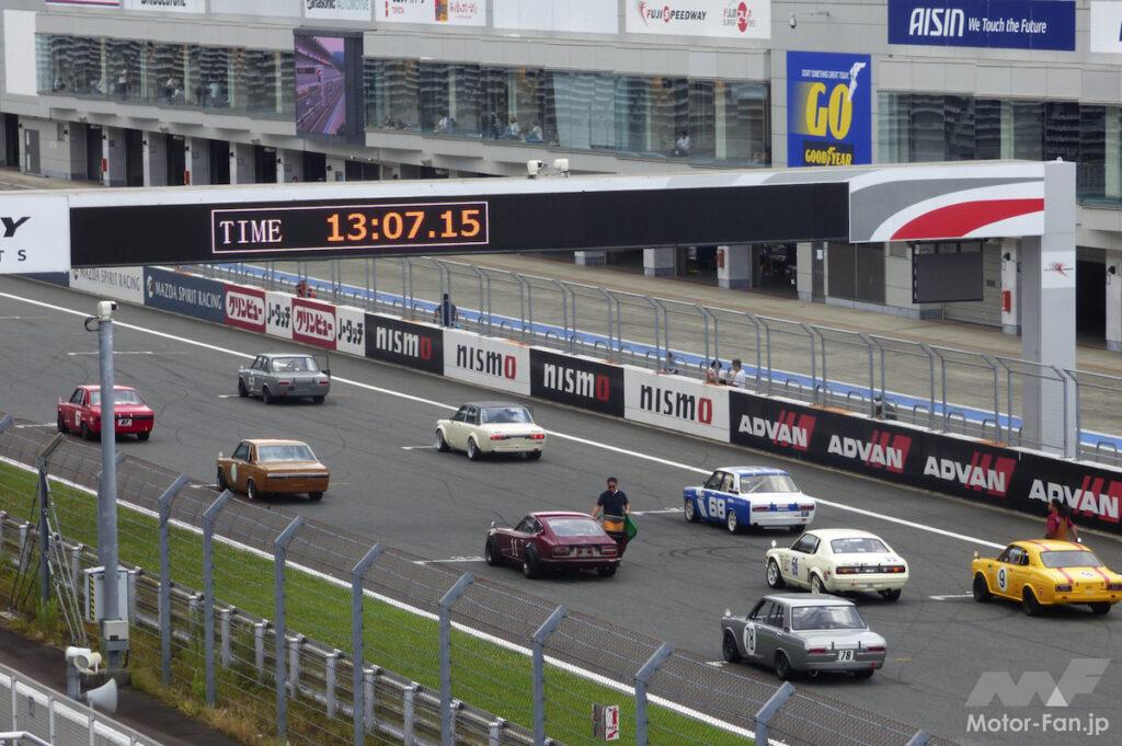 FSWの本コースで行われたヒストリックカーレース。510ブルーバードやB310サニーのTSマシン、ファミリア・ロータリークーペなどの往年の国産旧車たちのデッドヒートにスタンドの観客も盛り上がった。