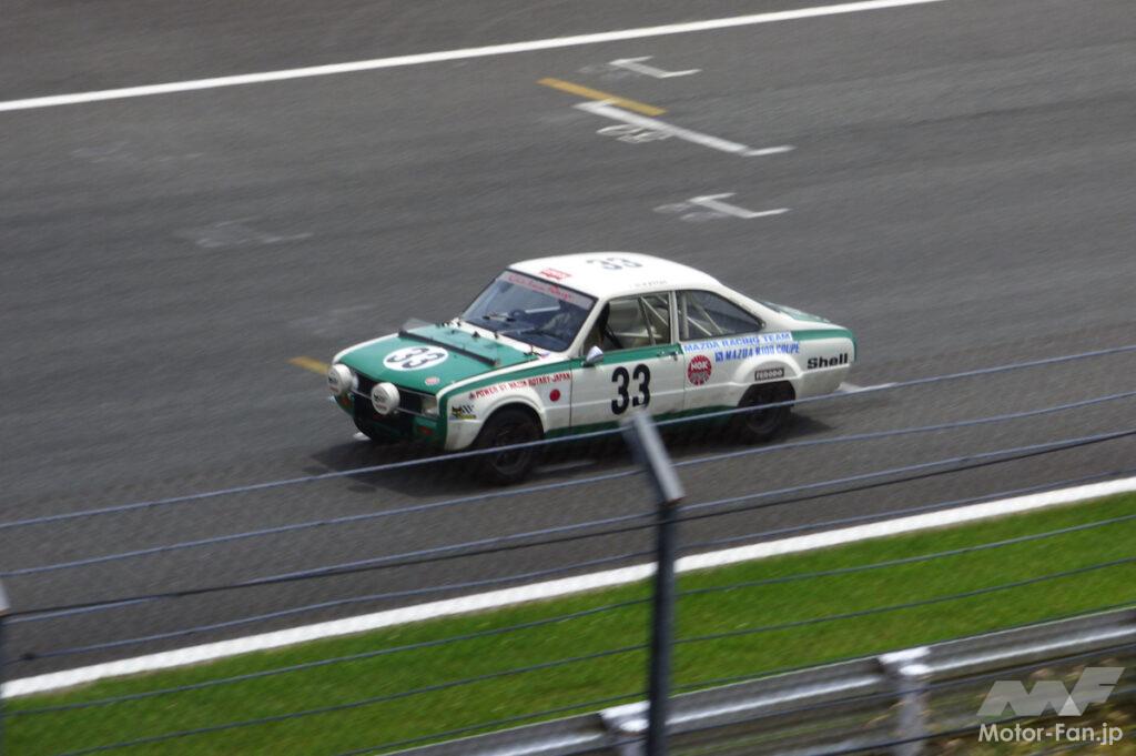 ロータリー車らしい独特のエキゾーストノートを響かせてグランドスタンド前を通過するファミリア・ロータリークーペ。