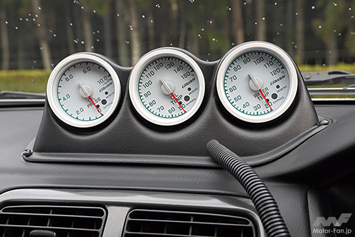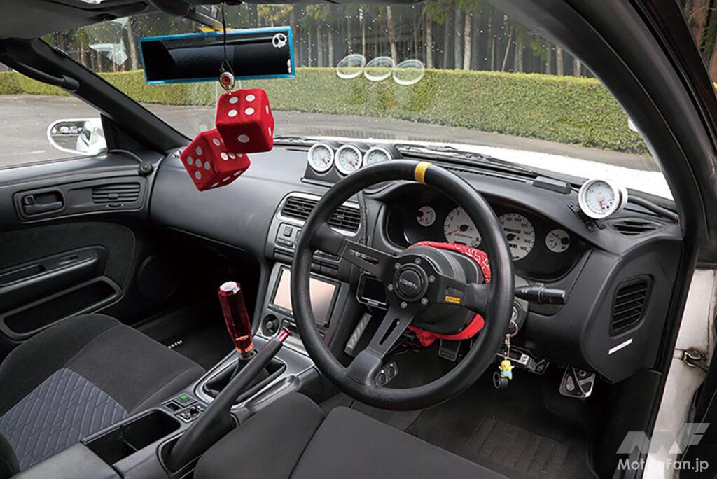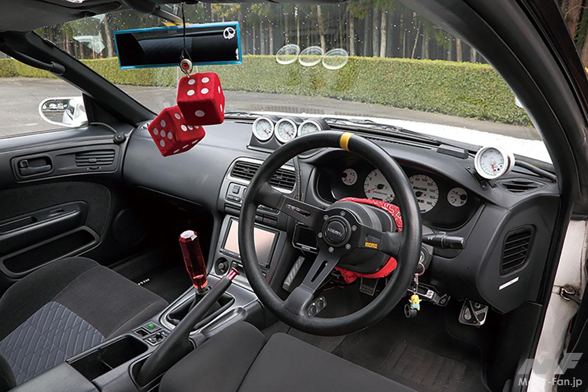 ステアリングがモモのタイプ08に変更され、ダッシュパネル上には追加メーターが設置されたインパネまわり。もともとはATであったが、ターボ用MTに載せ換えられたシフトレバーにはクリスタルタイプのシフトレバーが装着される