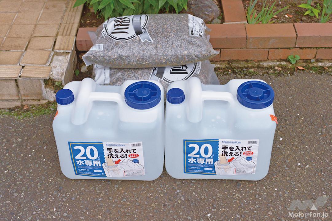 では、前60:後40は日常使うFF車として納得のゆくものなのか。意図的に重量バランスを変えたらどうなるのか。その実験を國政氏にお願いした。用意したのは20kg入りの砂利袋と20Lのポリタンク(水20Lはほぼ20kg)。これを使って重量配分を変えてみる実験だ。