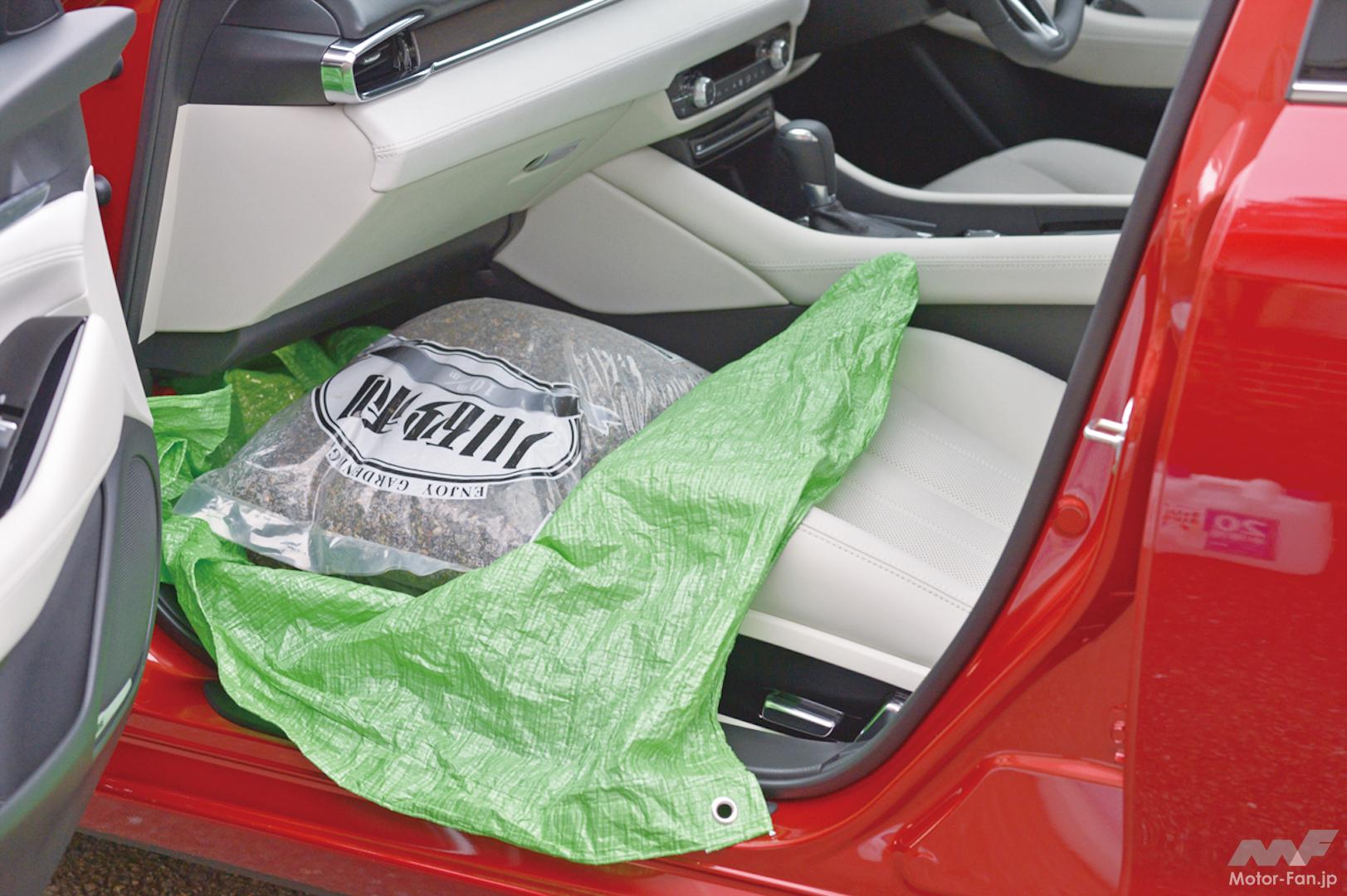 マツダ6の助手席足元に、車両重量を考慮して砂利袋ふたつを置いた。「素」の状態でタイヤ内圧を合わせ試乗してもらい、すぐに助手席に砂利袋搭載状態で試乗してもらった。