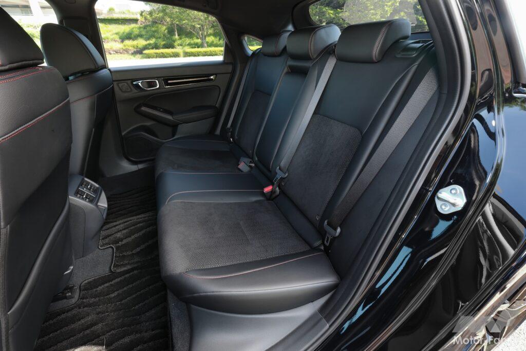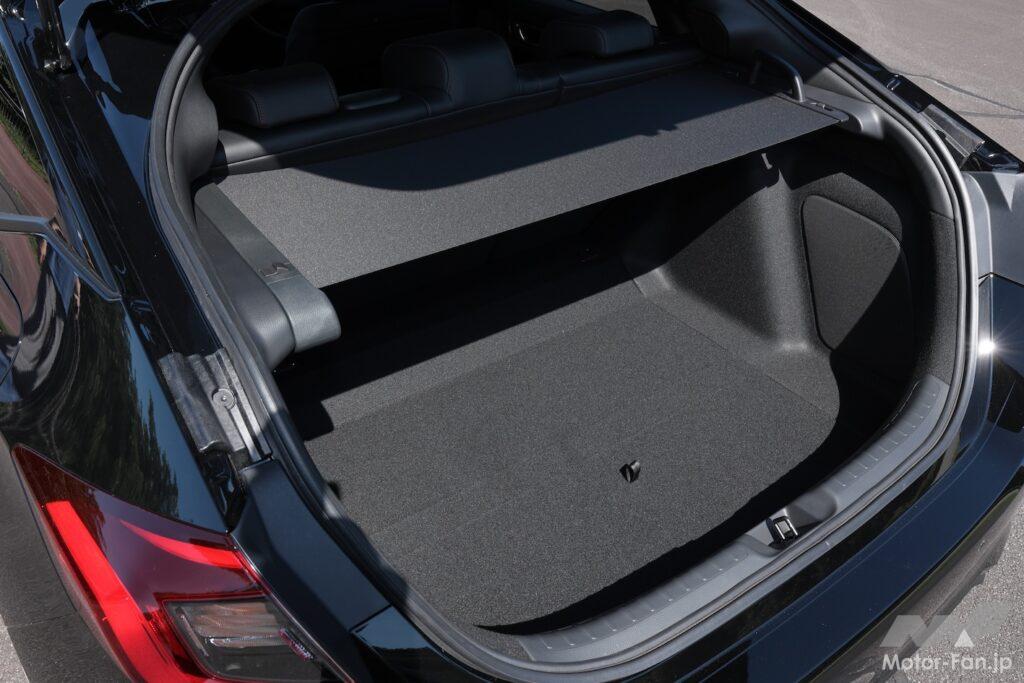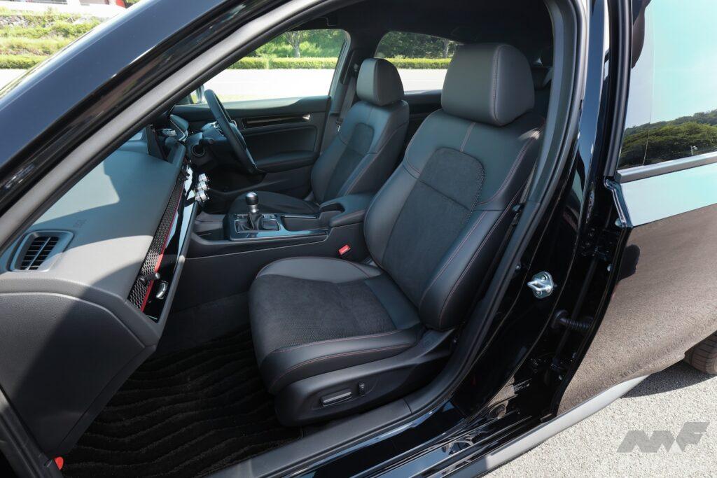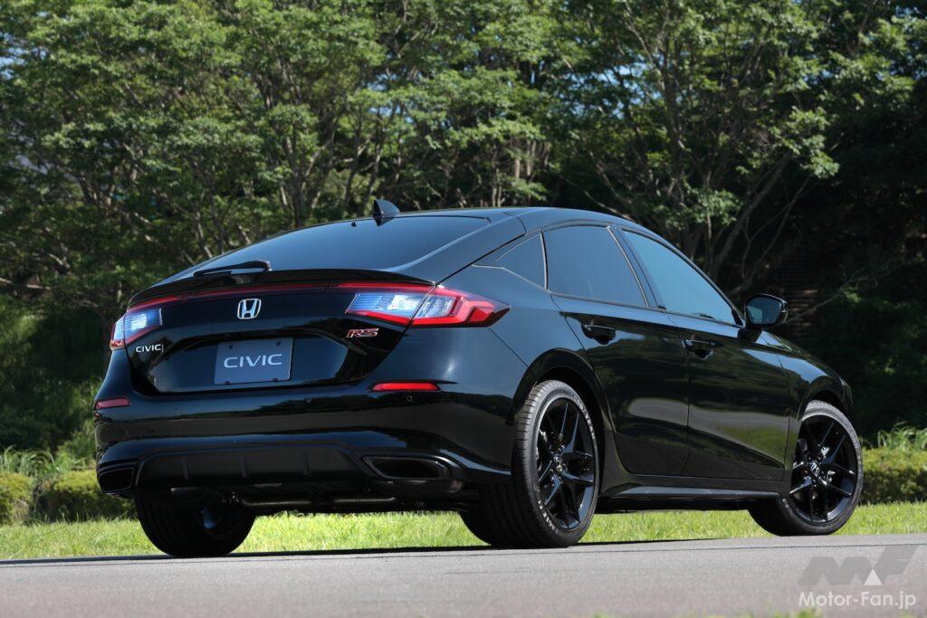 デザインはRS専用だ。前後に赤いRSバッジが付いているだけでなく、ヘッドライト、ドアミラー、ドアサッシュ、アンテナ、エキパイフィニッシャー、ホイールがブラック加飾の専用品となる。インテリアでは、空調のアウトレットに赤いピンストライプが入り、スエードのシート地にも赤いステッチが入る。ボディカラーはシビックシリーズ共通の全5色で、シーベッドブルー・パールが新色だ。