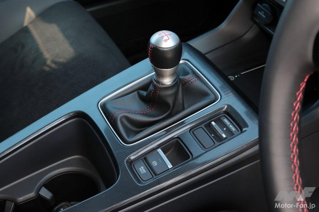 シフトノブは21年モデルの球形から、やや細身の紡錘形に変わっている。アルミ削り出しのタイプRの形状に近いが、グリップ部は革巻きだ(夏は熱くないし、冬も冷たくないはず)。クランクしたレバー機構はタイプRから移植しており、ニュートラル位置は10mm程度ドライバー側にオフセットしている。