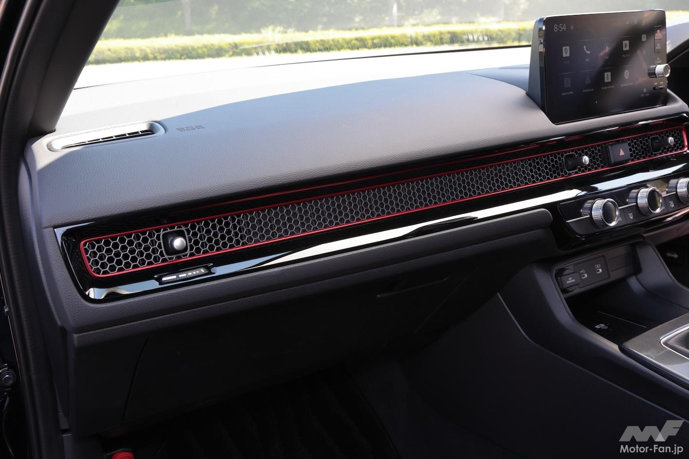 デザインはRS専用だ。前後に赤いRSバッジが付いているだけでなく、ヘッドライト、ドアミラー、ドアサッシュ、アンテナ、エキパイフィニッシャー、ホイールがブラック加飾の専用品となる。インテリアでは、空調のアウトレットに赤いピンストライプが入り、スエードのシート地にも赤いステッチが入る。ボディカラーはシビックシリーズ共通の全5色で、シーベッドブルー・パールが新色だ。
