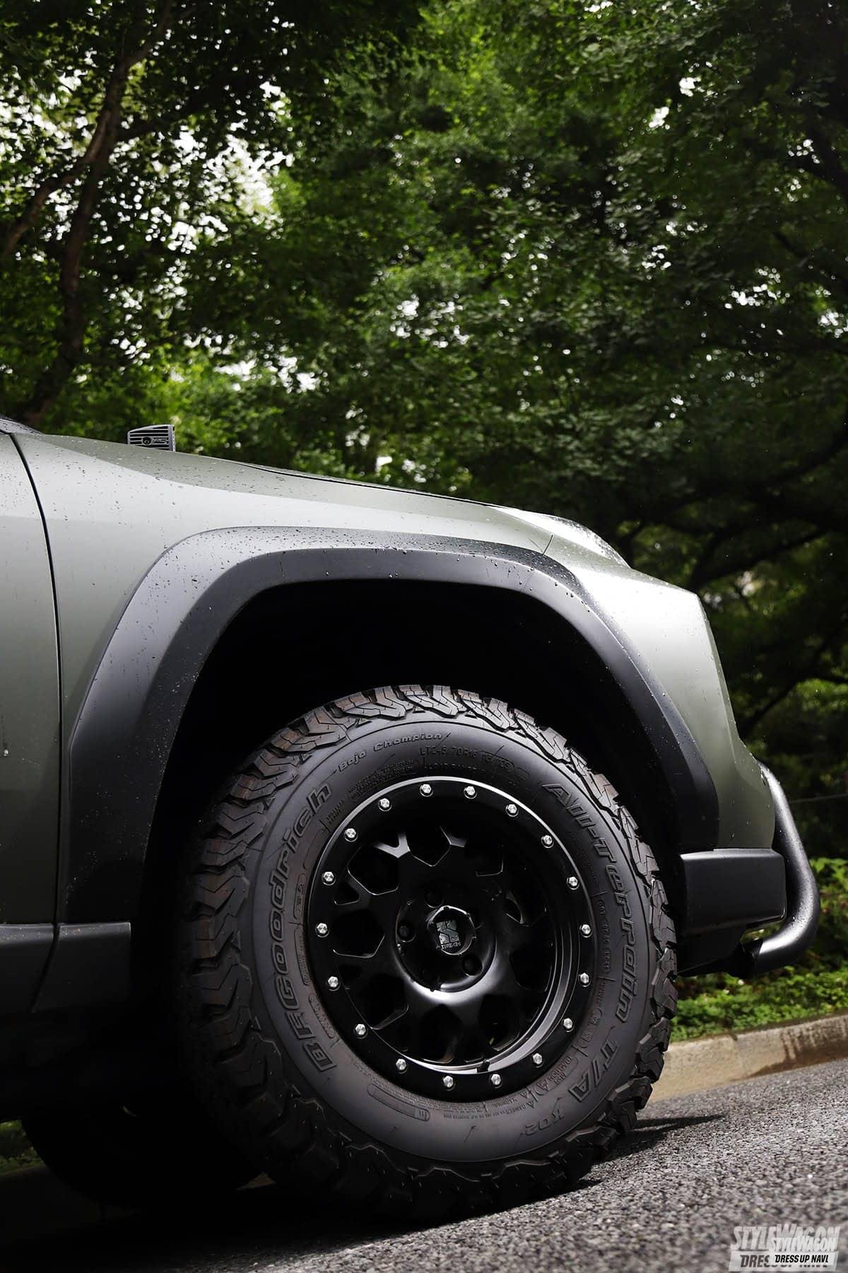 ボディカラーは“純正のアーバンカーキをマットにしたらどうなるのか”、そんな興味から試し塗りを何度も重ねて選んだもの。さらに2.5インチのリフトアップキットを組み込み、このボディカラーに合わせたホイールがサテンブラックのMLJ XJ04(16×8J+18)だ。