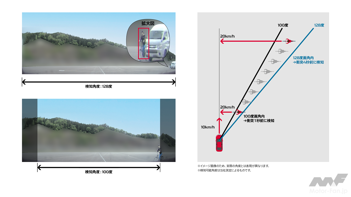※4 自車が10km/h走行時に20km/hの自転車が横断するシーンにおける危険検知のアセスメント条件。画角的に難しい条件とされているが今回の広角化により対応。