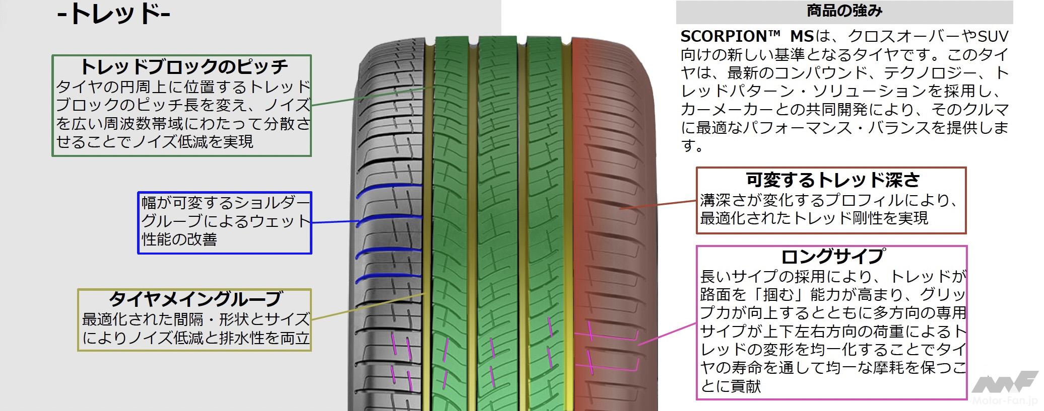 ハンドリング性能は素直で、頑張りすぎない。結果、誰でもどこでも安心して走ることができる。あまた走るSUVやクロスオーバーモデルは重量もサイズもさまざま、走る環境も多岐にわたる。そんな、マルチパーパスなクルマにとって、この『SCORPION MS』ならさまざまな乗り味や乗り手に柔軟に対応してくれる。