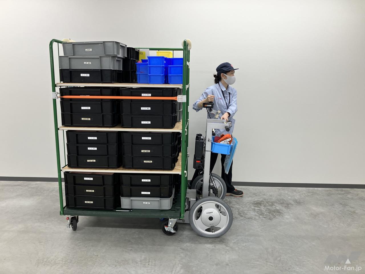 既存の台車にセットすることで人が押す力を電動モーターがアシストし、運搬業務の負荷を軽減する動力ユニット。特に自働化設備が配置できない狭い通路などに有効で、200kgまでの重量物の運搬が可能だ。