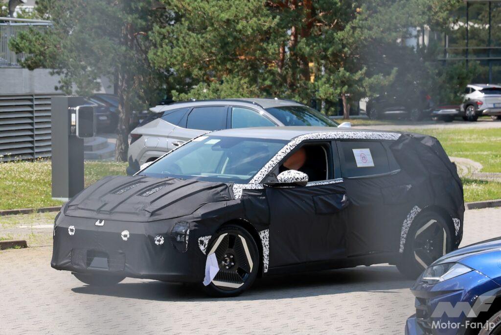 先日捉えたセダンと比較すると、同一のキャビンを維持し、同様のフロントエンドを備えているようだが、極端に切り詰められたオーバーハングを特徴とするテールが確認できる。この変更により、大型のEV6の弟分のような外観になっている。
