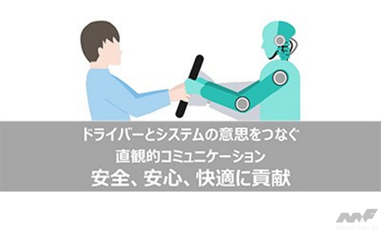 電動パワーステアリング(EPS)を介して自動運転システムと運転者の「意思」をつなげるシステム。運転者の入力トルク(ハンドル操作)などの情報と、車内外に取り付けられたセンサーによって検知・解析された車両運動とを統合し、その「システムの意思」をハンドルの振動や反力を通じて運転者に伝達する。この「人とシステムとの直感的なコミュニケーション」による運転アシストで、今までにない安全・安心を提供する運転環境を実現する。