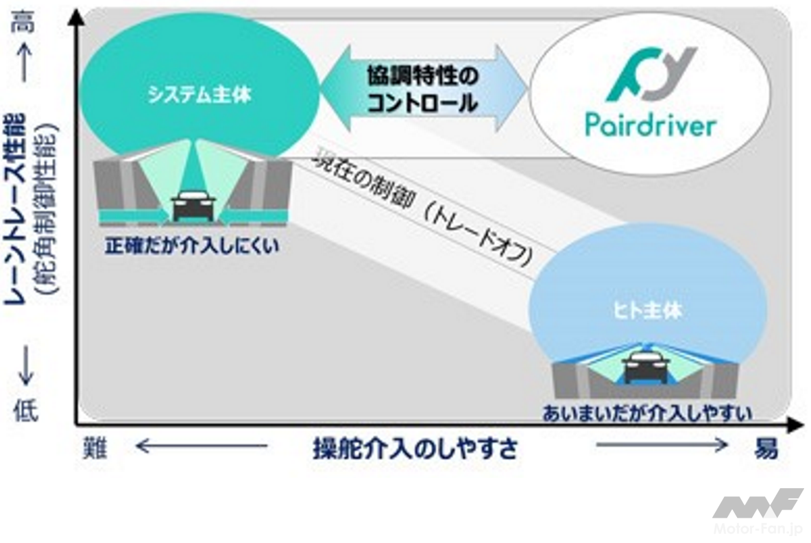 Pairdriverは「人とシステム、2つのドライバーが対等な関係で協力し合うこと」を意味している。システムに依存するだけの自動運転ではなく、人とシステムが調和し手を取り合うことで生まれる安心感や協調性を込めて表現している。