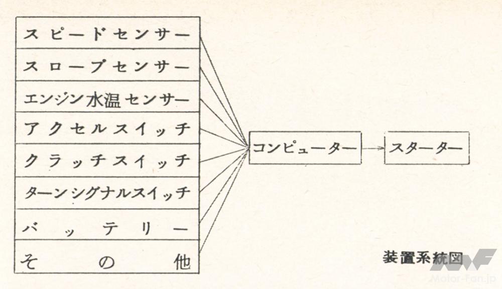 これら条件から、EASSを構成するデバイスがどのようなものかの想像がつくというものだ。すなわち「スピードセンサー」「スロープセンサー」「エンジン水温センサー」「アクセルスイッチ」「クラッチスイッチ」「ターンシグナルスイッチ」「バッテリー」「その他」、そしてこれらを統合する「コンピューター」が「スターター」に指令を送るという仕掛け。