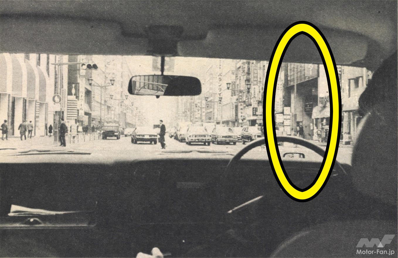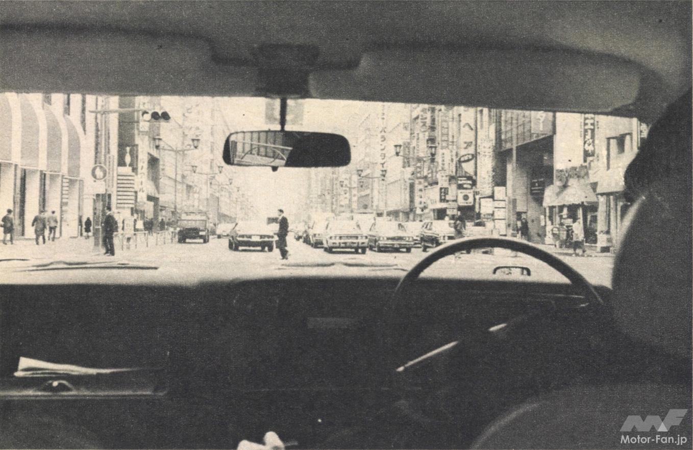 モーターファン掲載写真では、前方信号機下に交差点名を示すプレートがないので明確な場所はわからないのだが、誌面の写真横の「東京・銀座通りの交差点で赤信号となりクラウンはストップ・・・」という池田さんの添え書きをヒントに銀座通りを走行。交差点を通過するたび、写真と同じビルがどれかひとつくらいないかと前方を眺める。