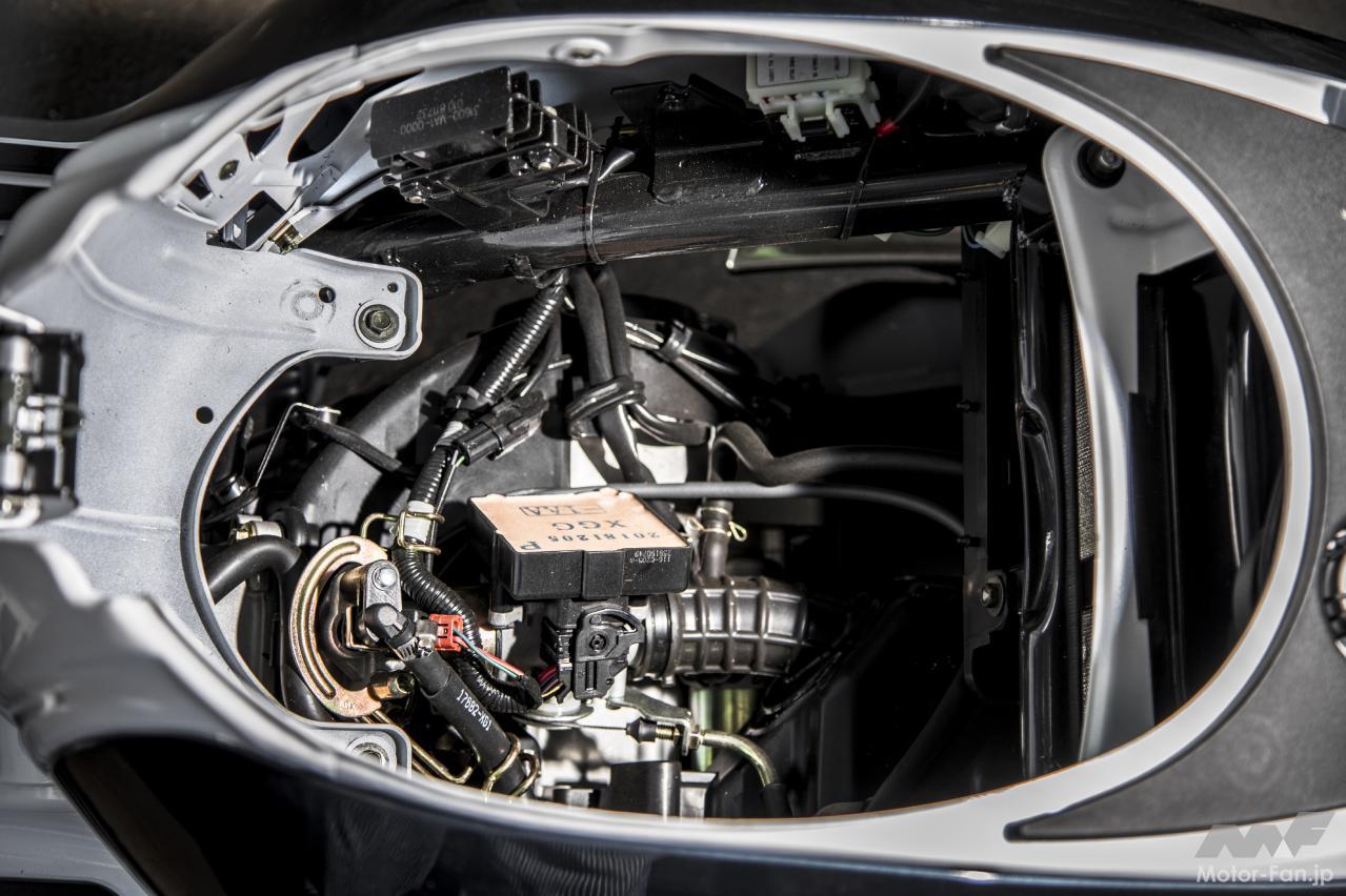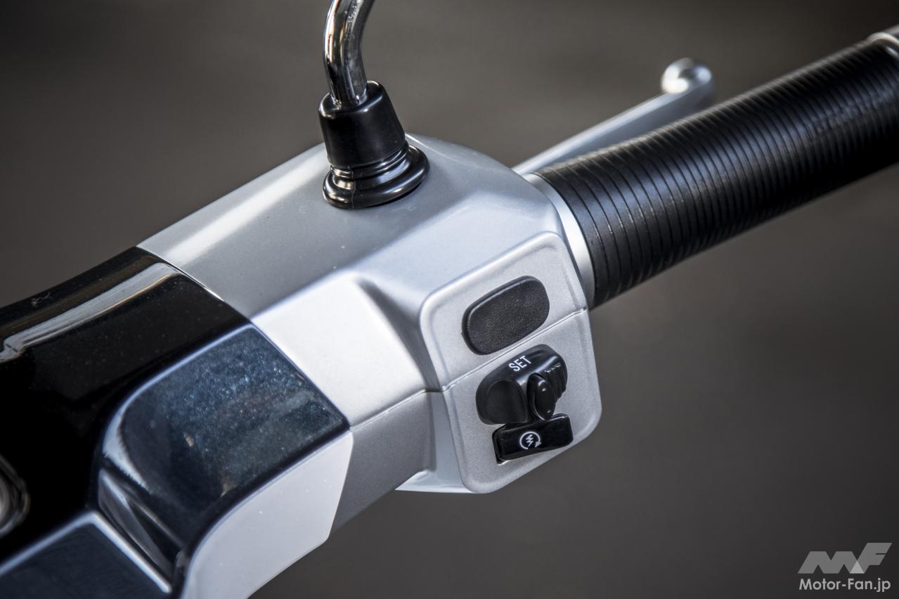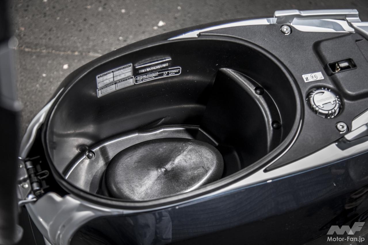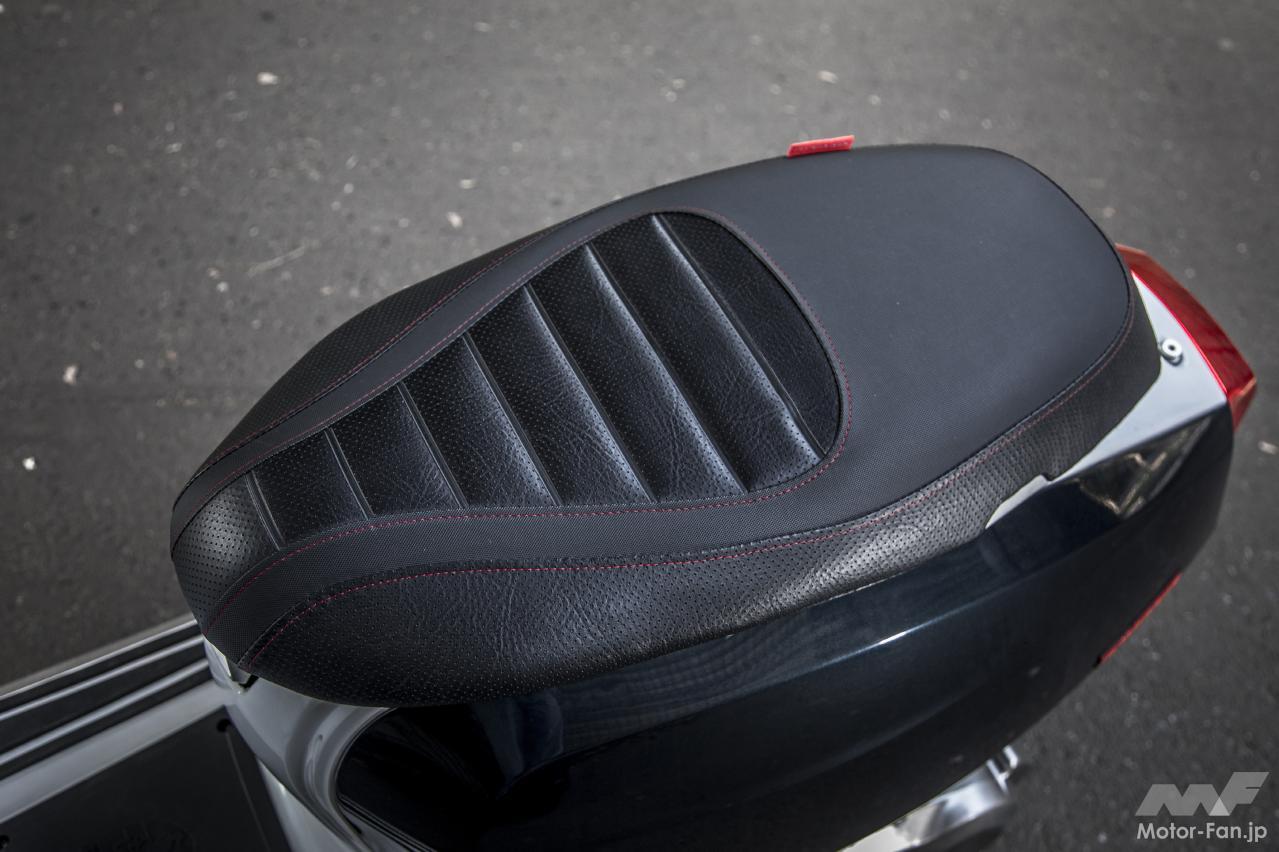 各部の仕上げには、ことごとくオリジナルのセンスが投入されているこだわりのある造形や使い勝手が込められている点も見逃せない。ハンドルスイッチも専用品が採用されているし、メットインスペースを持ち上げるとエンジン等の主要パーツにアクセスできるようになる。シートの作りも見るからに上質な品質感が漂ってくるのである。