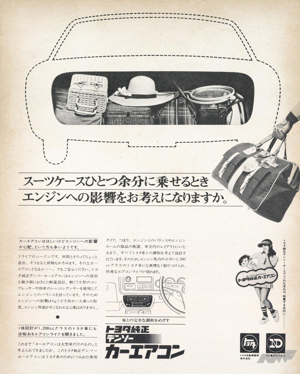 12.「スーツケースひとつ余分に乗せるときエンジンへの影響をお考えになりますか。 トヨタ純正デンソーカーエアコン」(日本電装、トヨタ自動車販売・1975(昭和50)年5月)