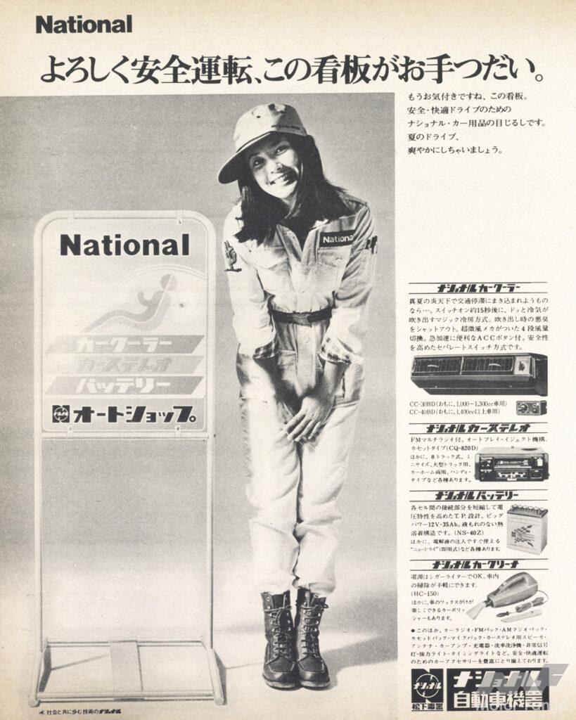 クーラーというよりも、カーステレオ、バッテリーなど、当時のナショナル自動車機器全体の広告。ここにある「ナショナルカーステレオ」は現在のパナソニックナビゲーション「ストラーダ」に、「ナショナルバッテリー」は「caos」の先祖にあたるわけだ。