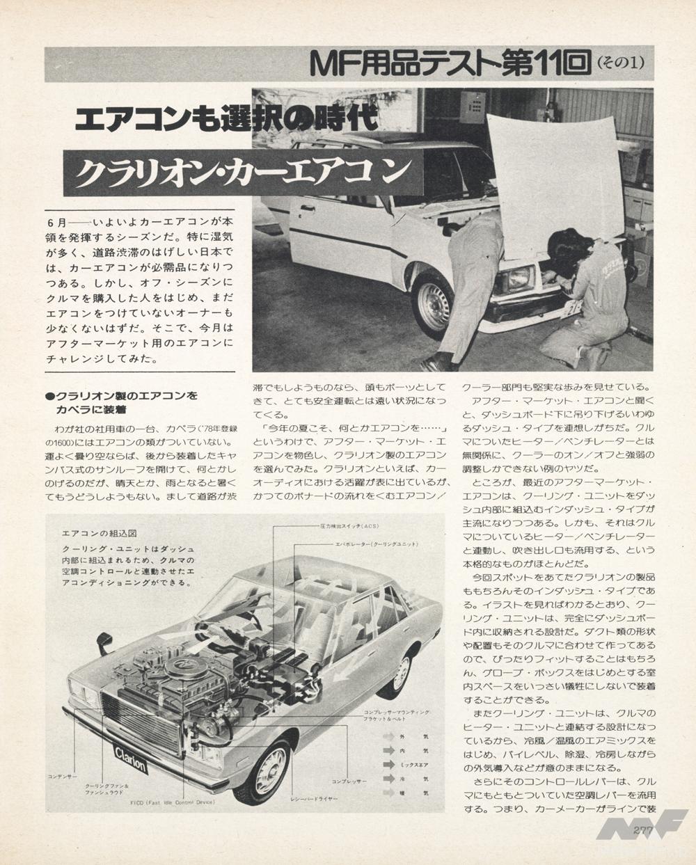 写真は、「わが社(当時の三栄書房)の社用車・1978年式カペラにはエアコンもクーラーもなく、晴天や雨の日には暑くてどうしようもないからクラリオン製のエアコンをつけた」という、読者には何の関係もない愚痴から始まるレポート記事の最初のページ。
