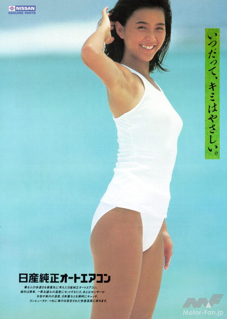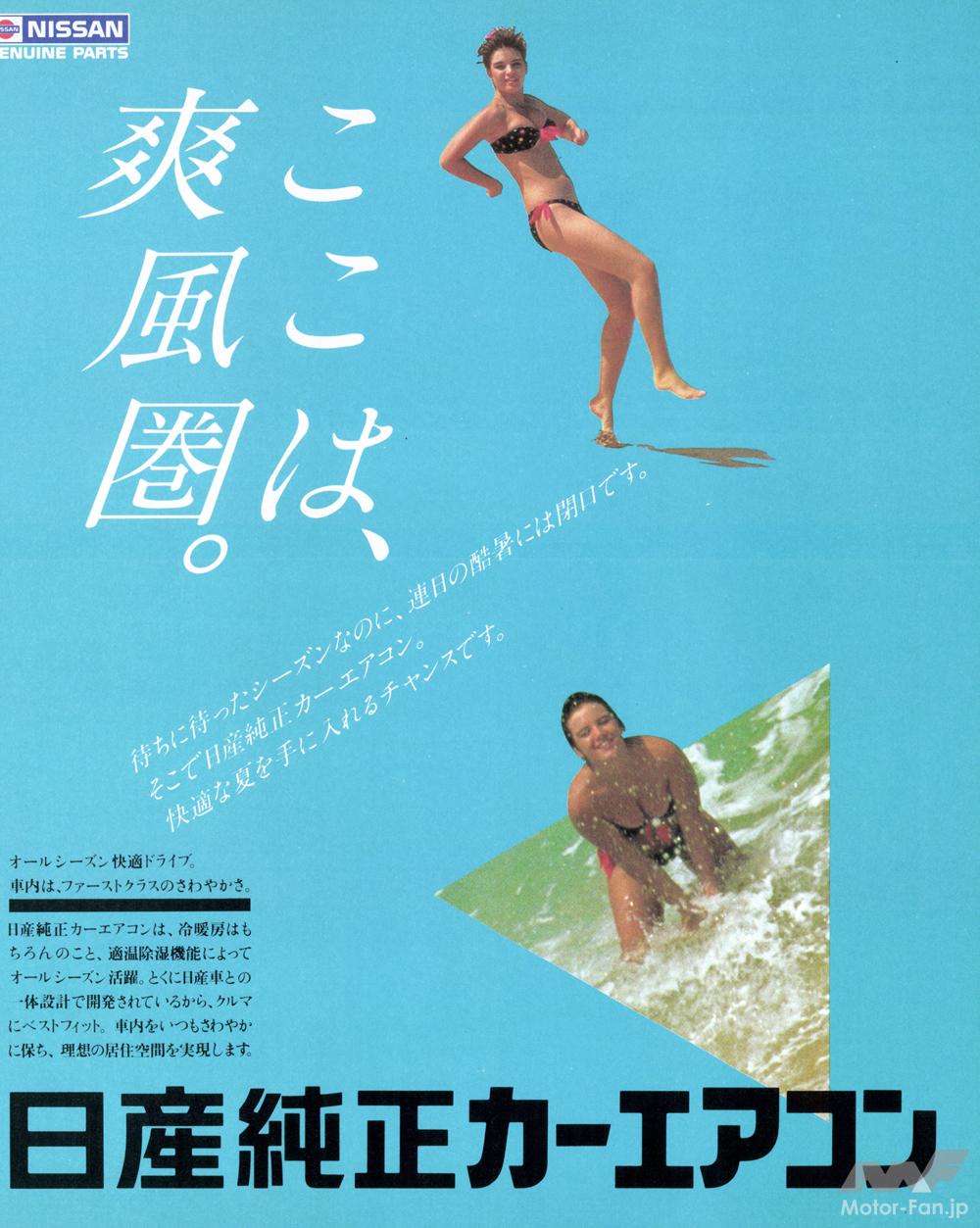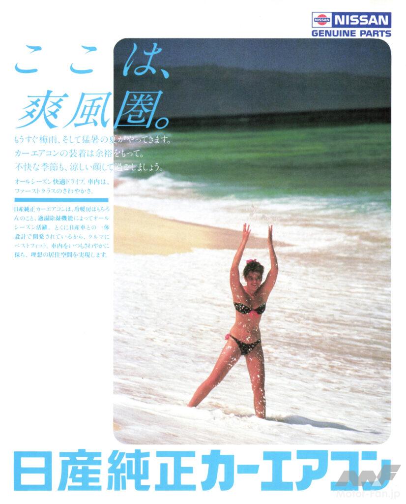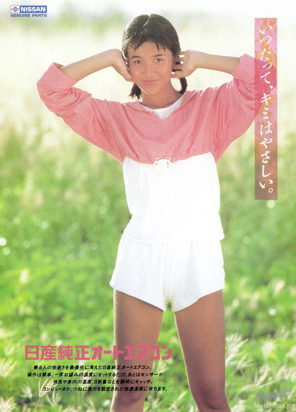 ときは1988(昭和63)年。時代が豊かになってきたからだろう、宣伝商品は「日産純正エアコン」から「日産純正オートエアコン」に昇格。「コンピュータが、つねに車内を設定された快適温度に保ちます。」と、ハイテク感も忘れていない。