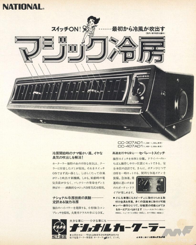 8.「スイッチON!・・・・・・最初から冷風が吹出す・マジック冷房 ナショナルカークーラー」(松下電器(現・パナソニック)・1973(昭和48)年5月)