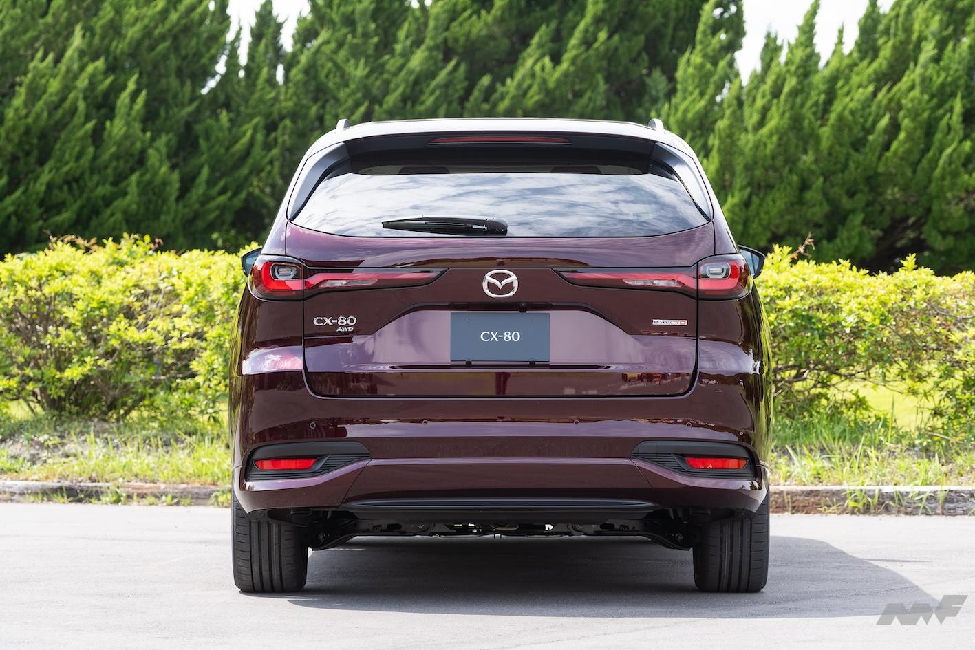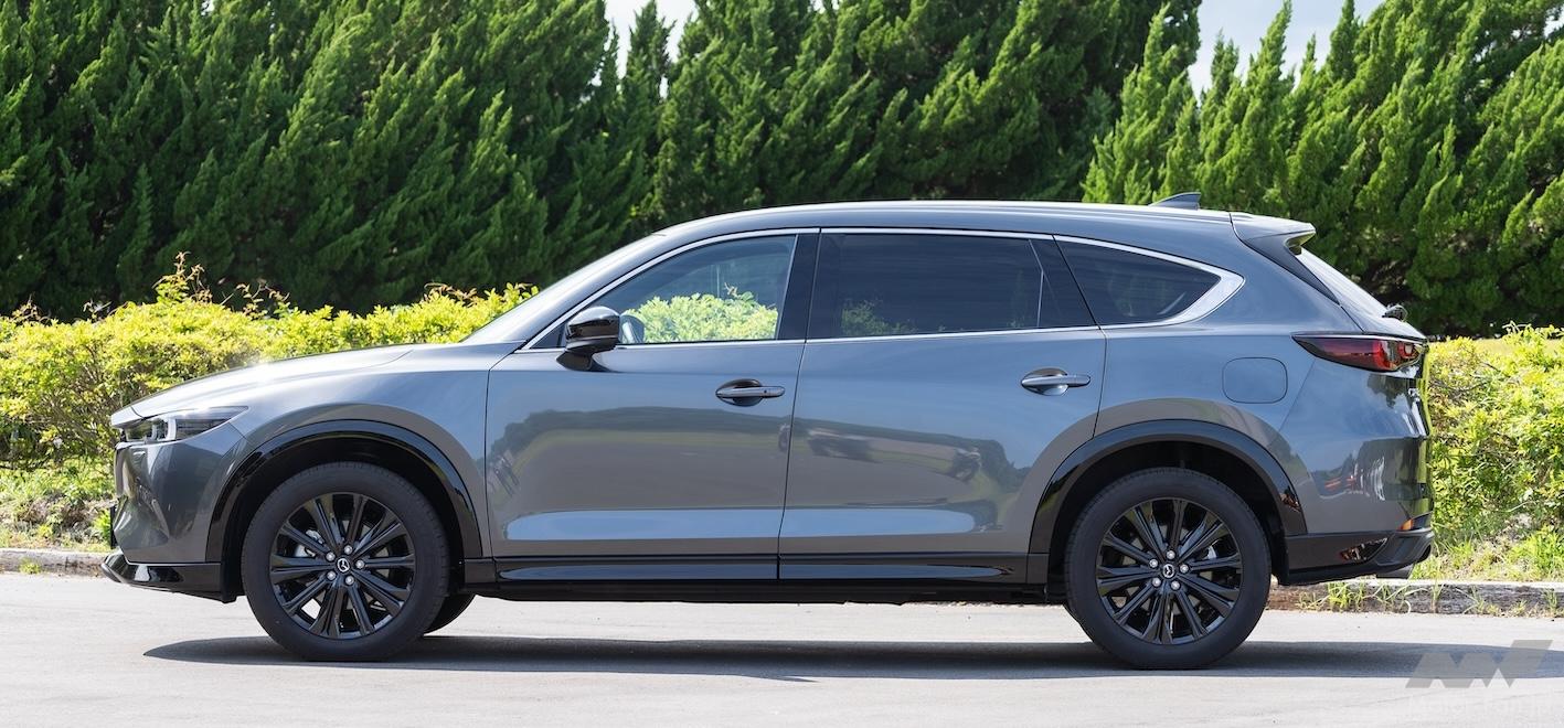 3列シートのCX-80は同じく3列シートを備えるCX-8の後継としての役割を担うが、プロポーションの違いは歴然。前輪駆動ベースのCX-8と後輪駆動ベースのCX-80では骨格がまったく異なり、CX-80は後輪駆動ベース特有の、安定感のある堂々としたプロポーションを実現している。