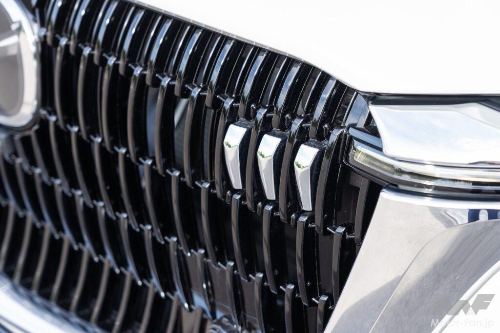 国内仕様のCX-80は、フロントグリルのメッシュを縦フィンに統一している(CX-60は縦フィンと横フィンを設定)。真正面から見た際はCX-80とCX-60の区別がつきにくいため、さりげなくCX-80であることを示すアクセントが採用された。グリルインシグニアと呼んでおり、グリルの左上に配置される。ブローチやポケットチーフをイメージしてデザインしたという。3本で構成されるアクセントのカットされた上の部分は、シグネチャーウイングの横のラインの延長線上で太陽光が反射する仕掛け。デザイナーがこだわった部分である。