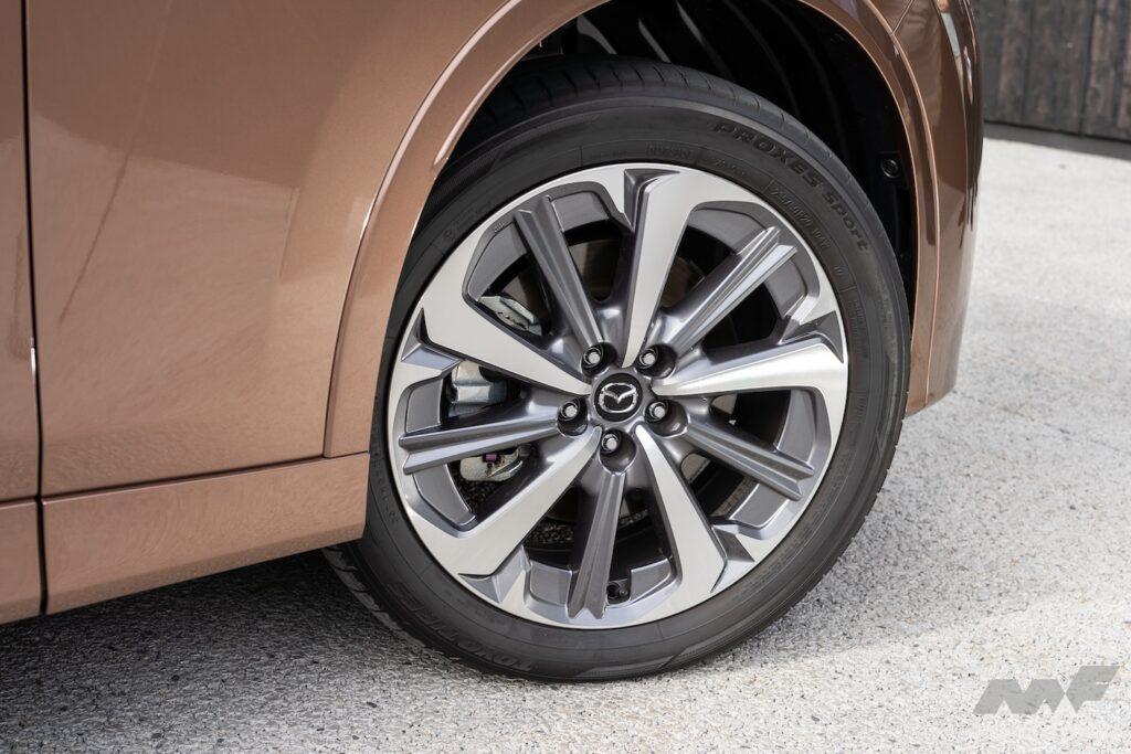 また、モダン系の切削ホイールは、CX-60ではブラックの塗装色としたがCX-80ではグレーメタリックとし、切削面とのコントラストを抑えて品格の高さを表現している。スポーティなCX-60に対し、品格のCX-80というキャラクター分けができるかもしれない。