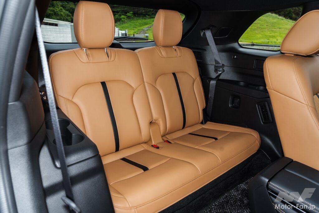 3列目シートは「大人がしっかり座れる、閉塞感、孤立感の少ない空間」を目指して開発された。リヤドア開口部は平坦にし、3列目シートに向けてはステップを分かりやすく配置することで乗降性に配慮。CX-8同様に、身長170cm相当の乗員の着座を保証している。ただし、ヘッドルームはCX-8比で約30mm拡大し、クオーターウインドウの大型化と相まって広々感を向上させている。2列目の頭上まで広がるパノラマルーフのおかげで視界が開けているのも、広々感の向上につながっている。