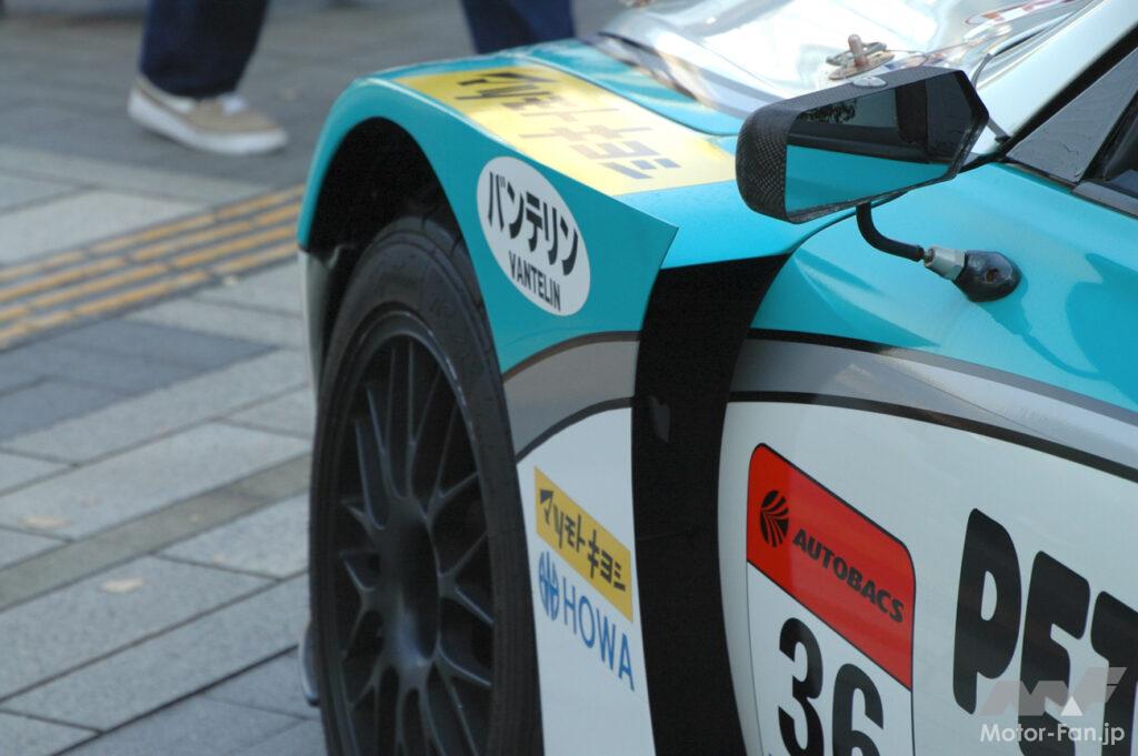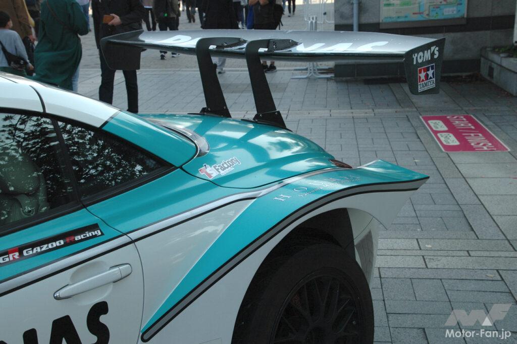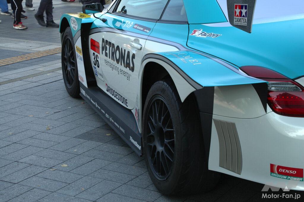 その仕上がりは圧巻で、吊り下げ式のリヤスポイラーや大きく張り出した前後のフェンダー、さらにはセンターロック式のホイールなど、一見するとホンモノのGT500マシンのように見えるほど。