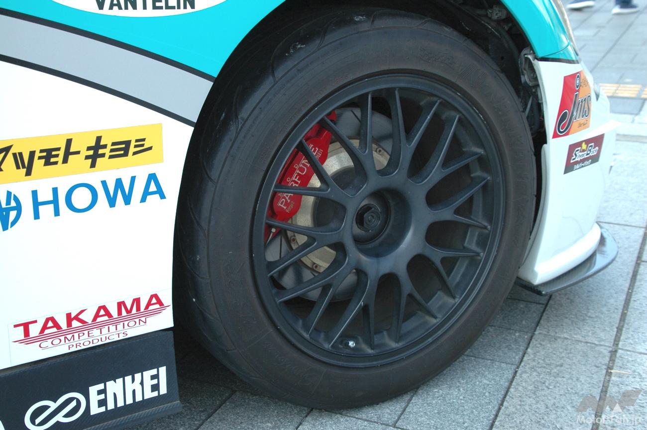 見事な造形のエクステリアだが、足回りは車高調を組んでいる以外はほぼノーマル。それだけに、ホンモノのGT500マシンと比べればホイールハウスのクリアランスが大きめなのはご愛嬌だ。