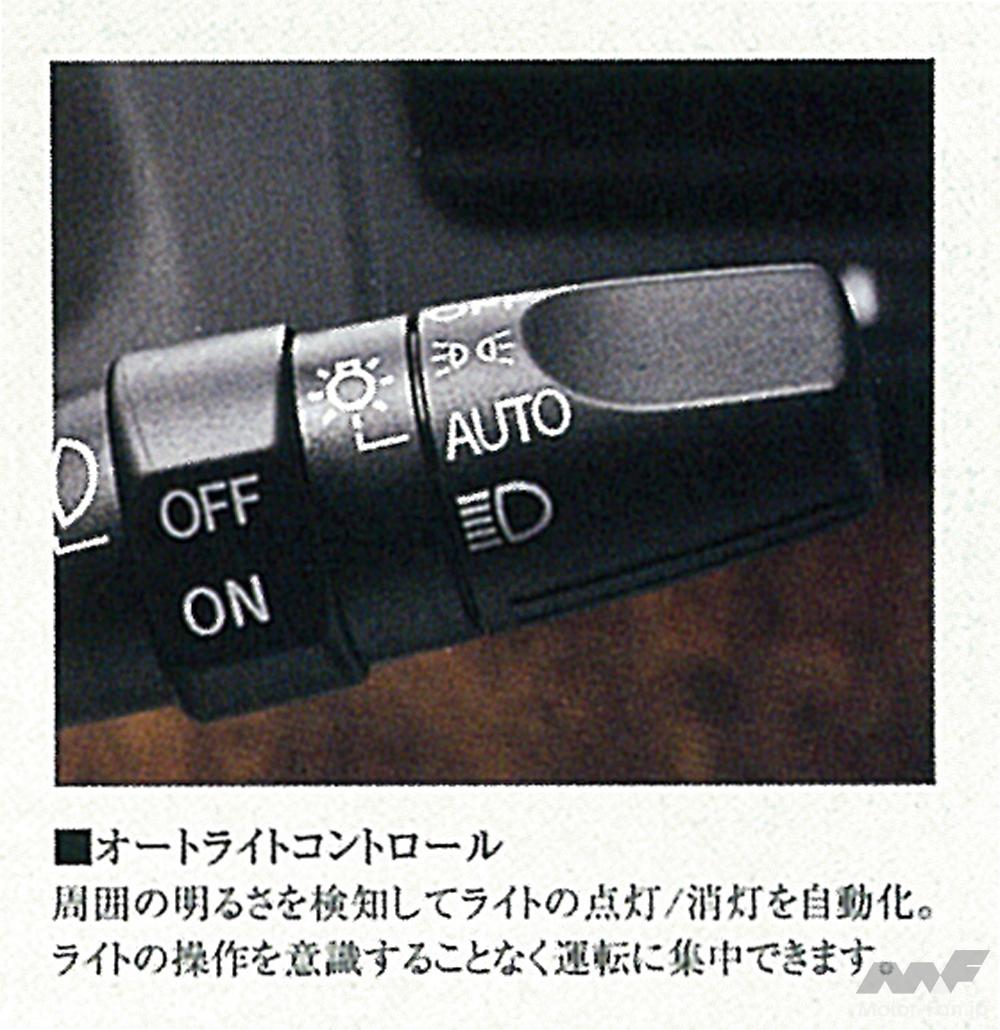 もっとも知られているのは、少し前まで主流だった「オートライト」だろう。ライトスイッチのポジションを「AUTO」に合わせておけばまわりの明るさ暗さを感知して自動でライトを点消灯・・・さきのコンライトから自動ロー/ハイ切り替えを取っ払ったものと考えていい。最初はクラウンやセドリック/グロリア級のクルマから「高級装備」の位置づけで始まり、時を経るにつれてカローラ、サニー級のクルマにまで広がっていったと記憶する。多くは「オートライト」または「オートライトシステム」と称したが、トヨタだけは引き続き「コンライト」だった。