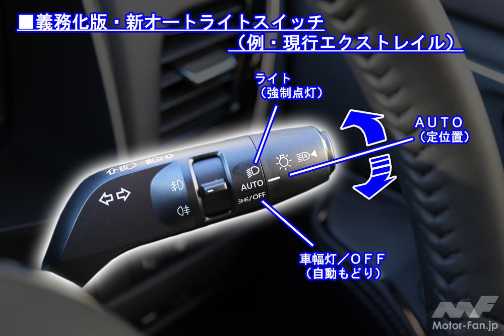 対してこちら義務化版新オートライトは機能もスイッチ構成も従来とはまったく異なる、完全な安全対策の一環となっている。