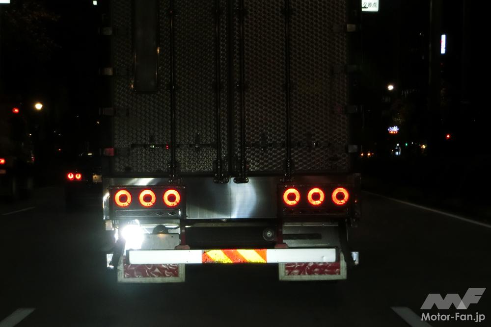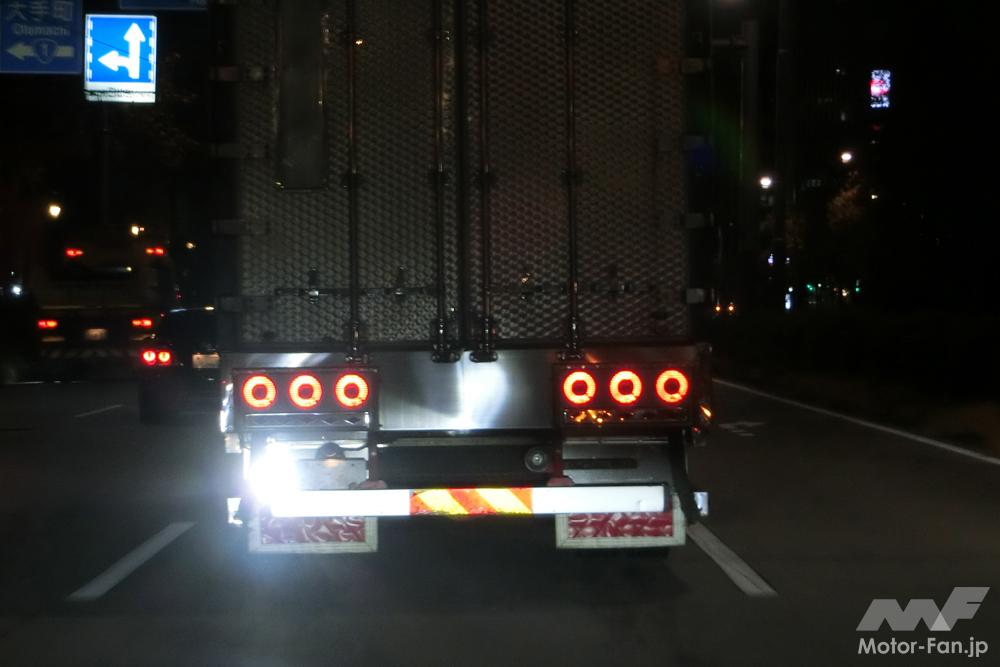 夜間走行時、このようなトラックの後ろについてしまったが最後、パネルに映った自車のライト光のまぶしさに惑わされながら走ることになる。ただでさえ許しがたいのに、中には後輪後ろのマッドガードにあたるパネル(あれ、何ていうんだ?)までギンギラにしているやつがいて、これがユラユラ動くものだから反射光が疑似的にハイビームになったりロービームになったり・・・そのようなときに限って前後左右にクルマがひしめいていて、車線変更で逃げることもできない。