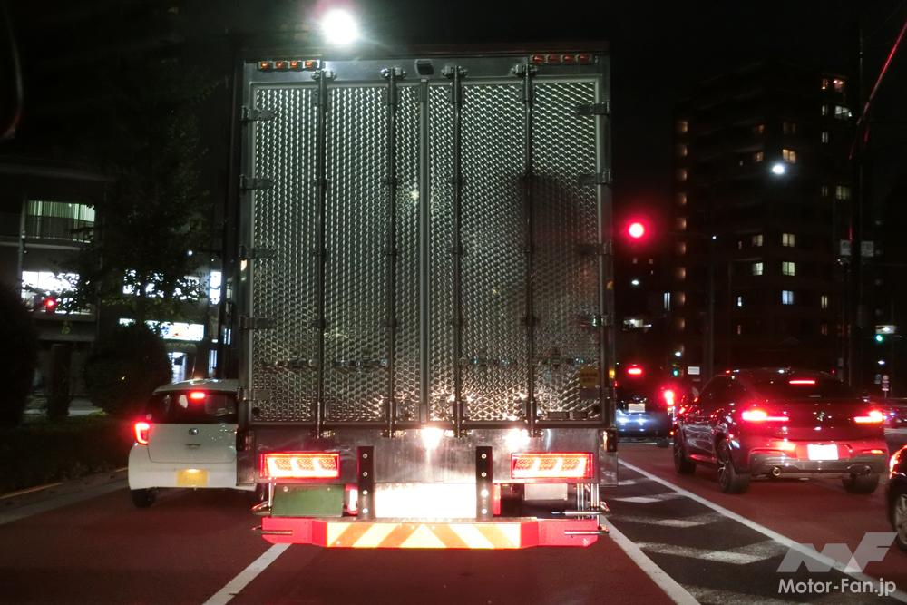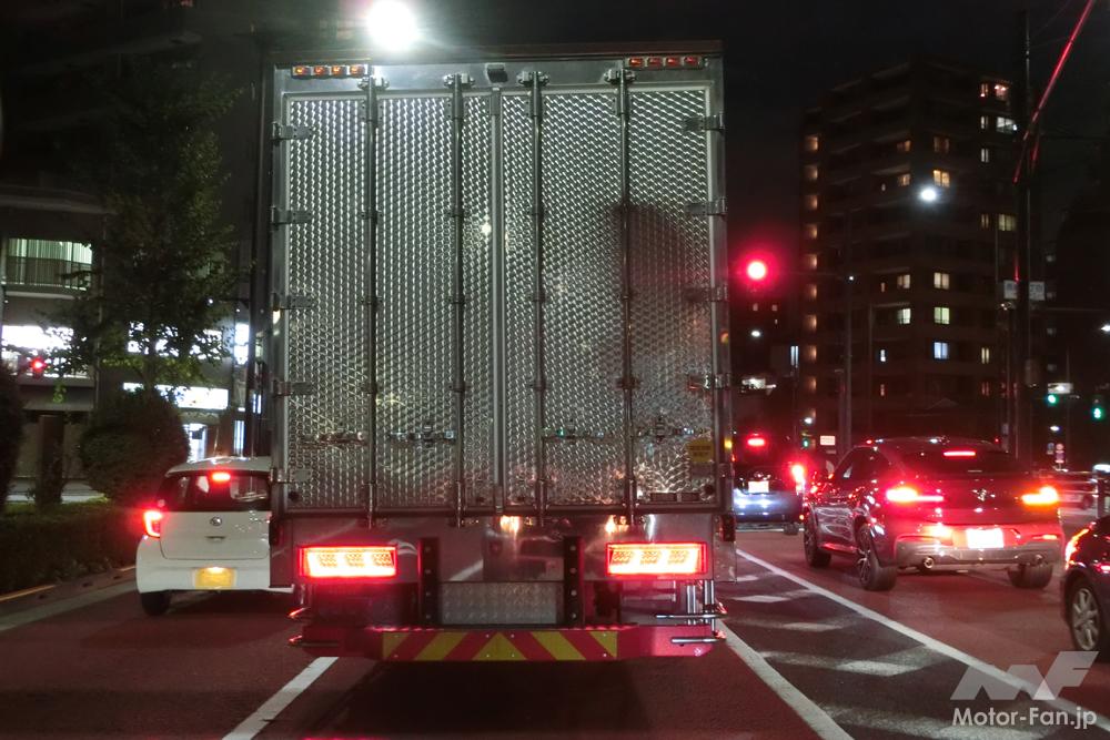 何のことかというと、大型トラックの後ろにあるギンギンギラギラの金属めっきパネル。こんなもの、自動車メーカーやトラックメーカーの工場段階で出たとは思えず、おそらくは架装メーカーの仕業か運送業者が納車後に加飾しているのだろう。