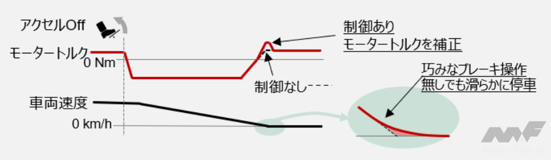 日立 Astemo では、こうした電動化車両の特徴である、モーターのトルクの特性や回生ブレーキの制動力を生かし、アクセルをオフにした際の、モーターの制動力が最適になるようトルク量を制御し、ジャークを抑制するアンチジャーク制御が開発された。この制御により、熟練したドライバーによる巧みなブレーキコントロールで揺り返しの少ない滑らかな停車を、一般のドライバーでも簡単に実現できる。