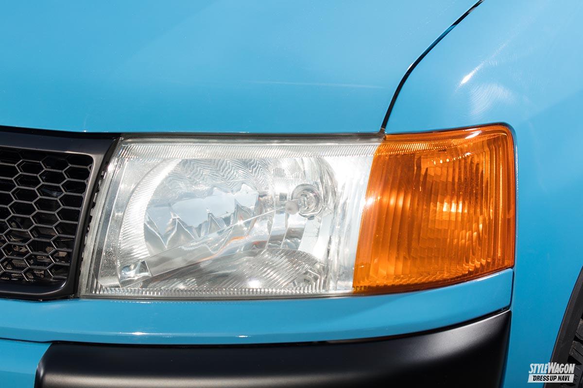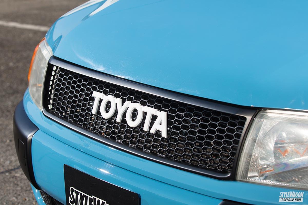 かなり使い込まれた感のあるベース車(H17年式GL)を、時間をかけて丁寧に内外装カスタムしたもので、エクステリアは、アルルブルー×マットブラックによる全塗装と、ワンオフグリル、ヘッドライトのオレンジペイント、フェンダーモール装着など。車高はアップサスによる約30㎜のチョイ上げ。