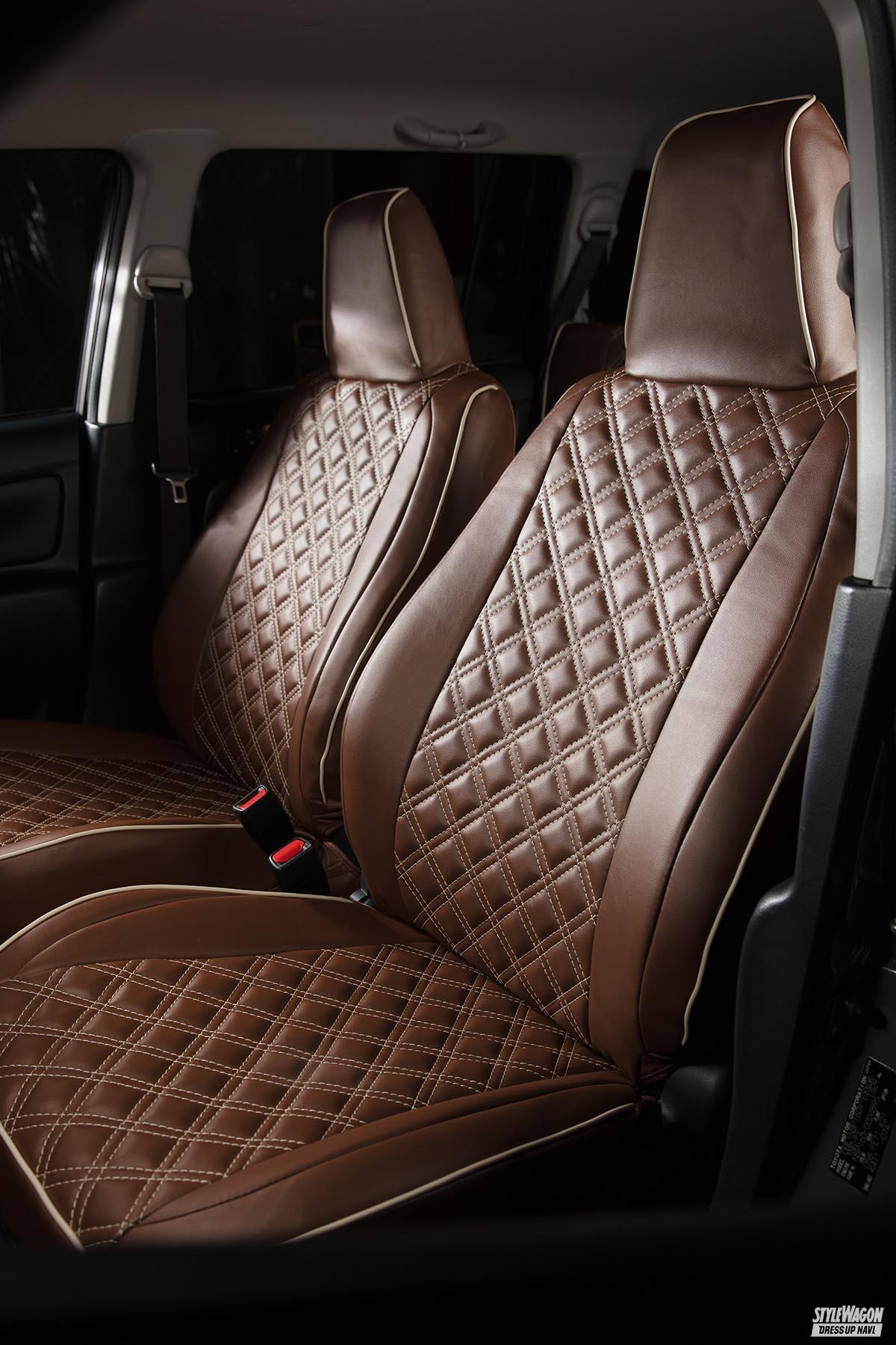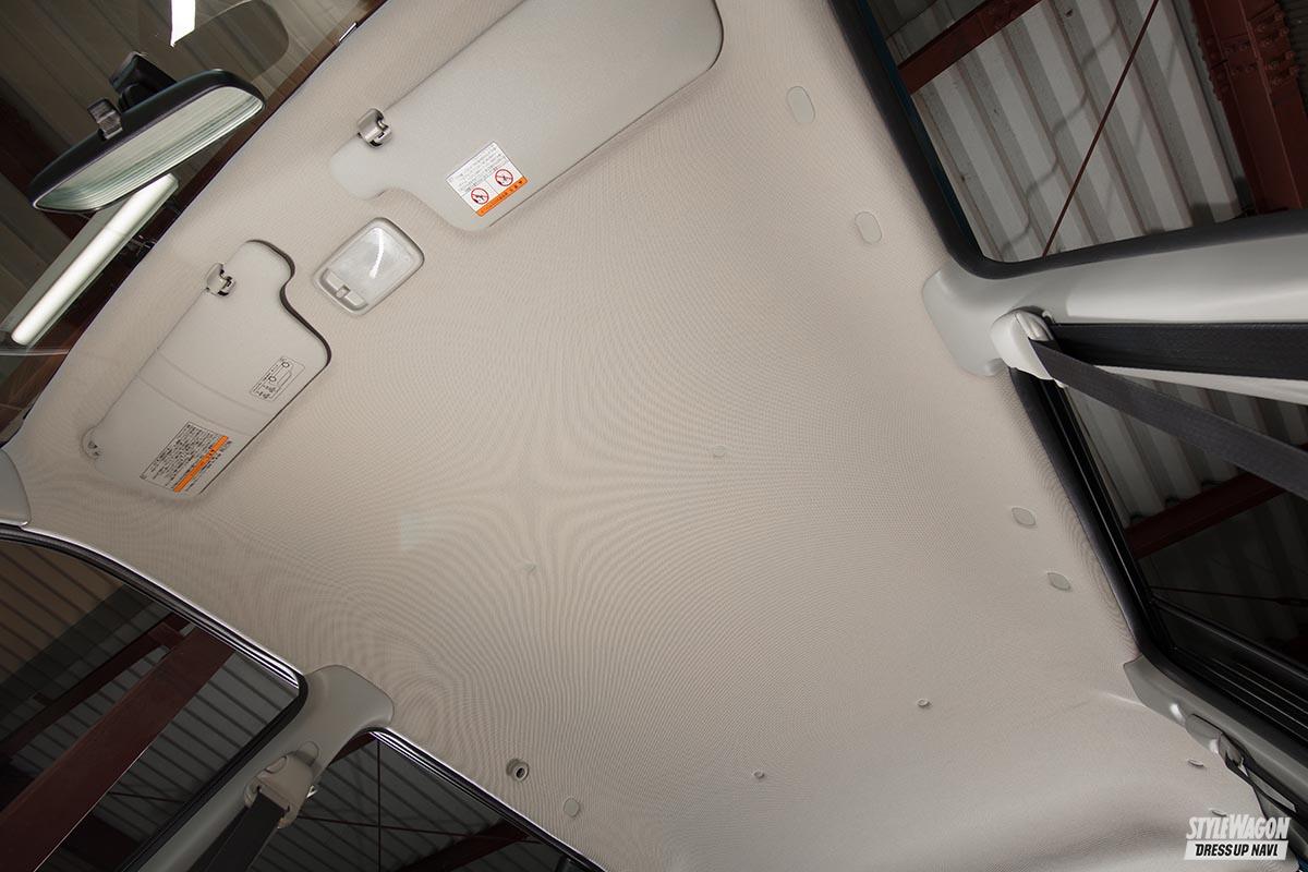 商用車として使われてきただけに、インテリアの汚れや生地の傷みなどがヒドいのはプロボックスに共通する事例。一度全体を洗浄してから、ダッシュなどを塗り、天井は張り替え、シートカバーやフロアマットを交換することで、非常に清潔感のある内装に生まれ変わっている。