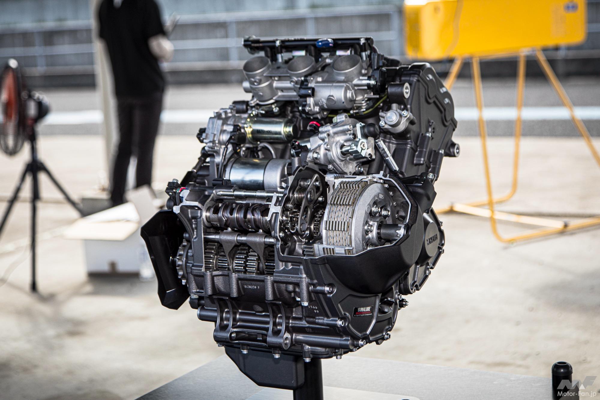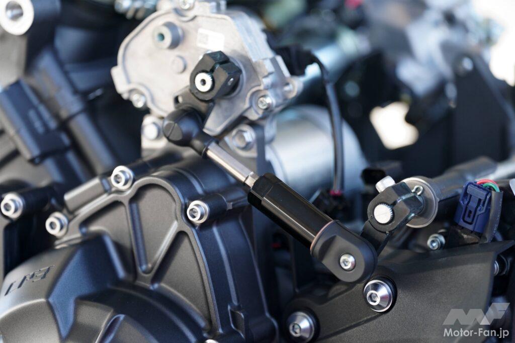 肝心のシフトフィールにもこだわり、シフトロッドにはスプリング内蔵型を新開発した。これは予め縮めたスプリングの力を一気に解放しギヤ抜きを素早くする機構で、会場に展示のあったカットモデルで確認すると瞬間的なギヤ抜きが確認できた。次に、抜いたギヤの噛み合い時間を短縮するためMT-09の従来モデル(2021年)が備えていた5つのギヤドッグ(凹部分)を、2024年モデルのMT-09シリーズでは6つに増やし、凹部とかみ合う時間を短縮(=回転角を縮小)させた。