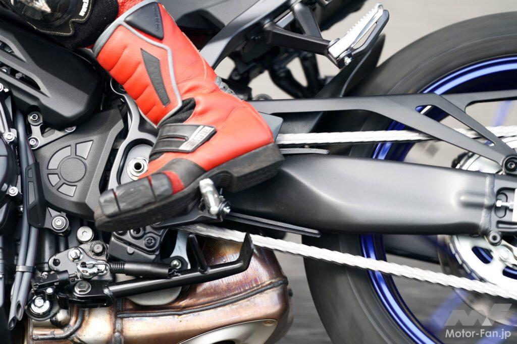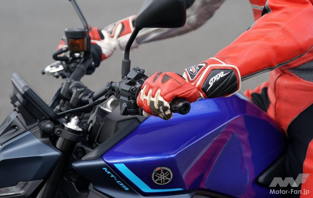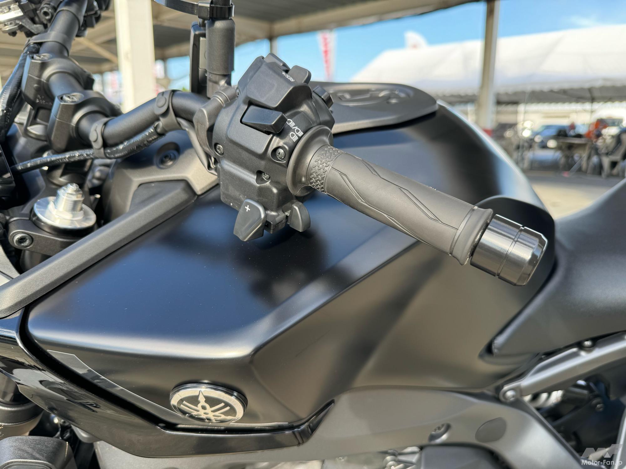 0.1秒という素早いシフトアップ操作を司るのが左手のひとさし指で操作する「シーソー式シフトレバー」だ。ひとさし指をレバーの前において手前に引くとシフトアップ、今度はシフトレバーの内側に指を移動させて前に押し出すとシフトダウンする。YCC-S時代のように親指でのシフトダウン操作は求めないから、シフトアップ&ダウンの際にグリップ保持力が弱まることがない。この進化はとても大きい。
