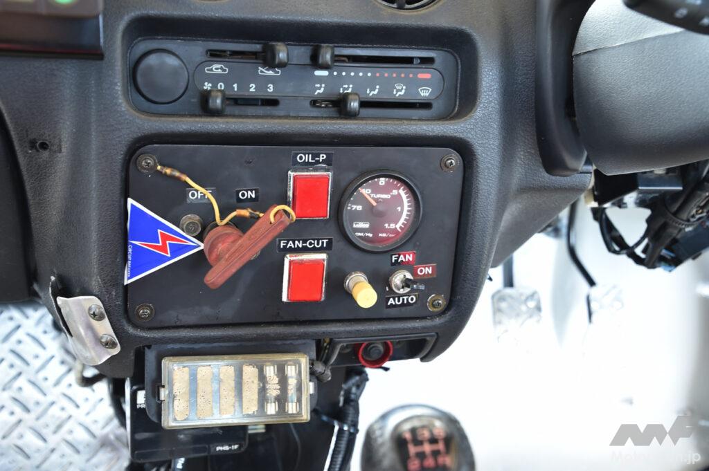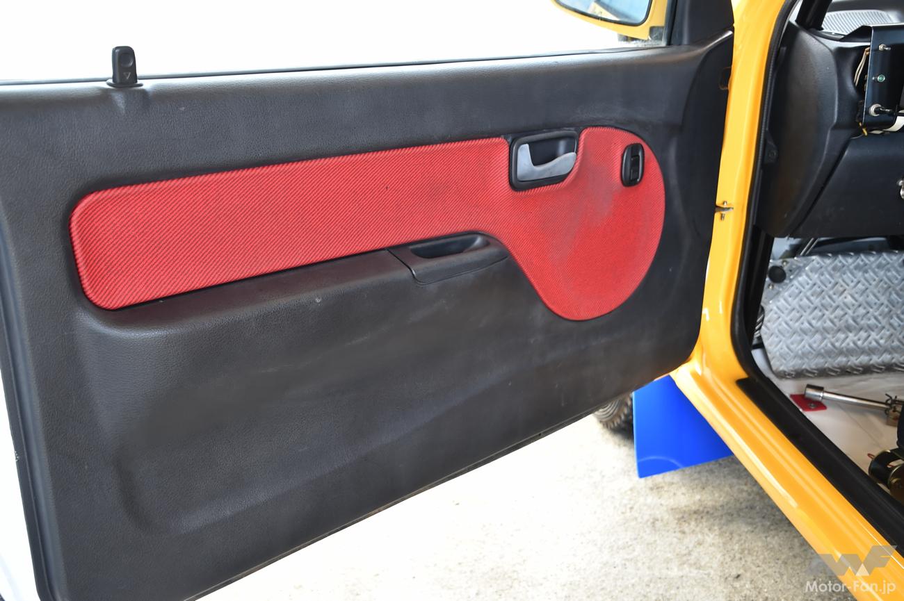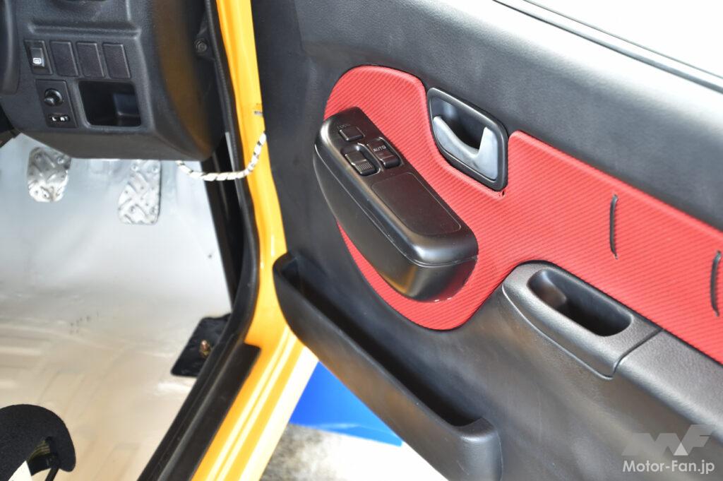 しかも、RX-Rはヴィヴィオのトップグレードなので、パワーウインドウが標準となっており、このグループA車両にはそのまま残されていた。ただ、トップグレードではあるのだが、スーパーチャージャー+CVTの「GX」に装備されるエアコンがRX-Rには装備されていないのは、走り志向だったからだろうか。