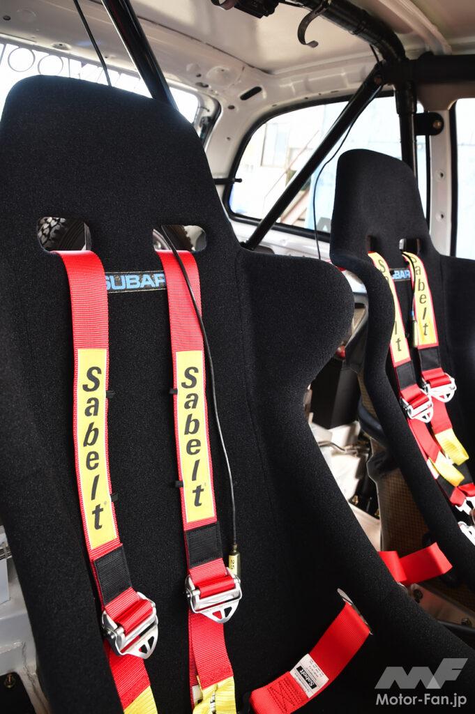 EVA製のフルバケットシートはSUBARUのロゴが入ったオリジナル品。レストアにあたり当時の職人が表皮を張り替えるなど補修しているが、その際にロゴだけは元の表皮から移植しているという。ただし、実戦でのパトリック・ジル車のシートはレカロ製のSP-Gを装着していたそうだ。