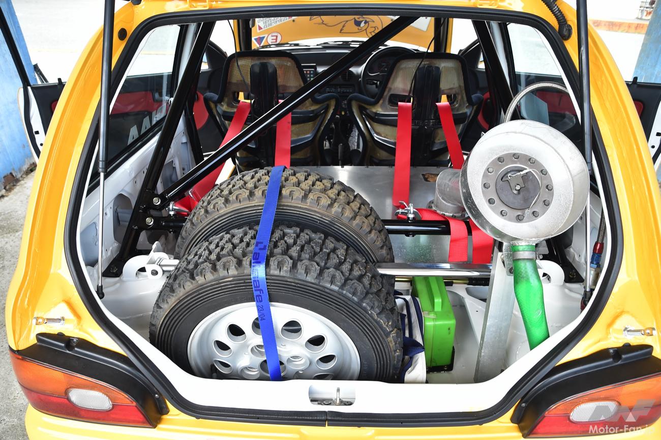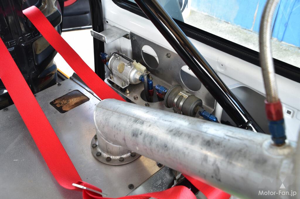 ラゲッジスペースはグループA車両として大きく変わっているところで、燃料タンクは公認の安全タンクをリヤシート位置に設置。バッテリーも後席左端に移設されている。13インチの小径とはいえスペアタイア2本を収め、安全タンクと長めのパイプが繋ぐ給油口もラゲッジルーム内に収められる容量は、セダンを名乗るもののボンネットバンの流れをくむ2ボックスボディの賜物か。