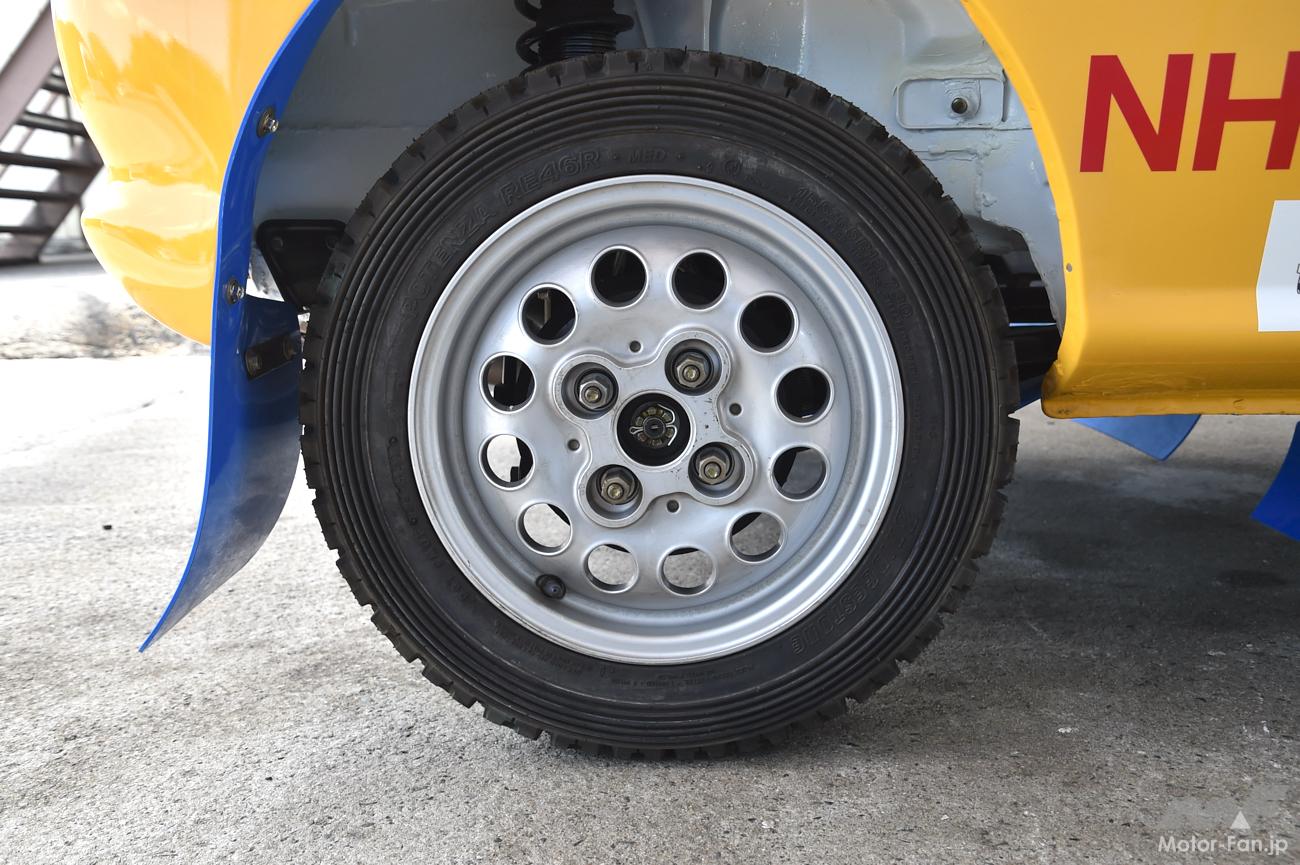 ホイールはKITサービスオリジナル品を装着している。何より驚いたのがそのホイールに装着されたタイヤ。ブリヂストンのラリータイヤはPOTENZA RE46Rだが、サファリラリー仕様の特別製。しかも、このタイヤは当時モノのデッドストックなのだ。流石に30年落ちのラリータイヤで走行するのは憚れるので、走行時はノーマルタイヤに履き替えた。